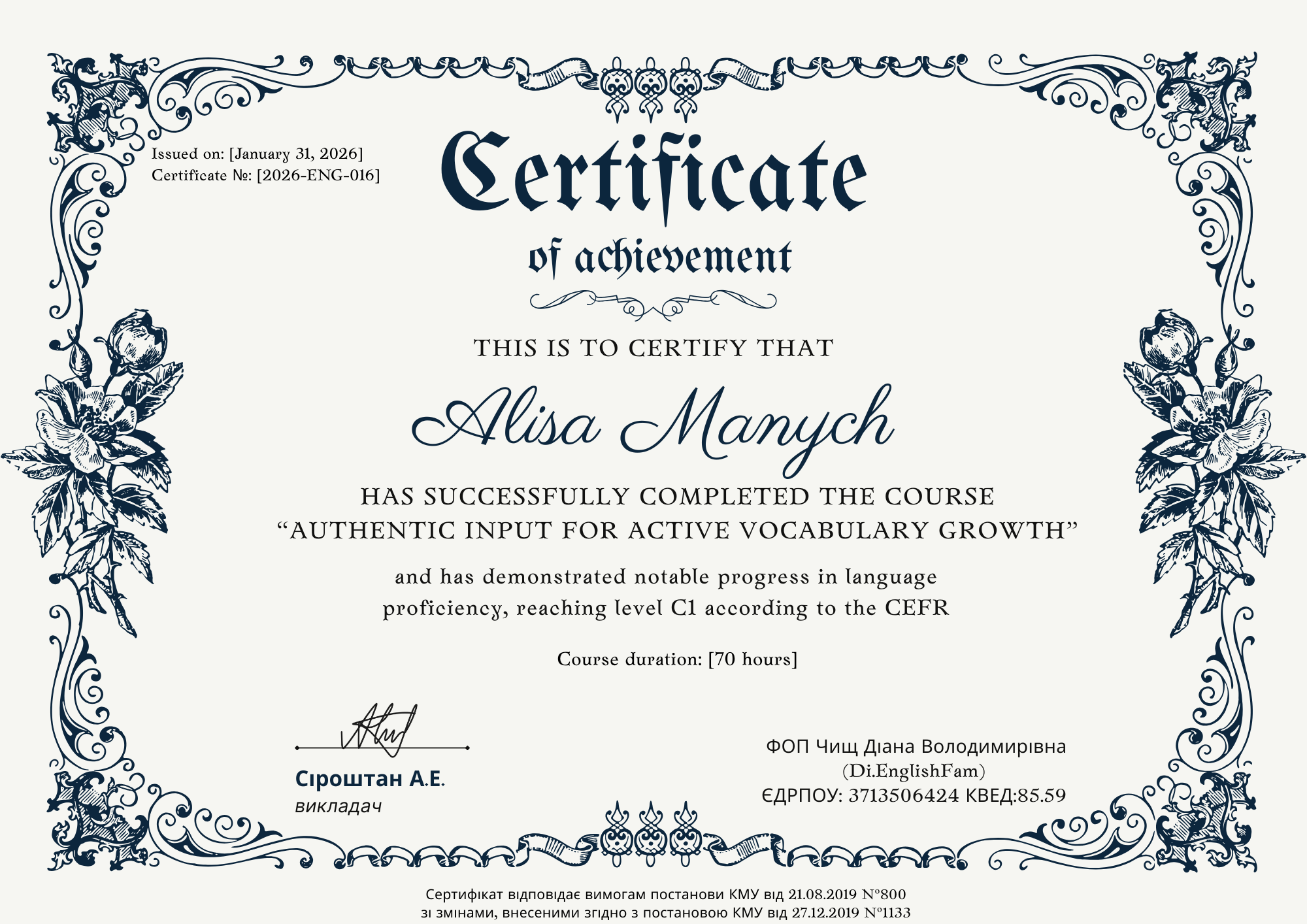 Постоянно интересуюсь современными методами преподавания и работаю над собственным профессиональным развитием. Сейчас готовлюсь к сдаче международного экзамена уровня C1 CAE. Для меня важно создать на занятиях дружескую атмосферу, где можно не бояться ошибок и уверенно практиковать язык.