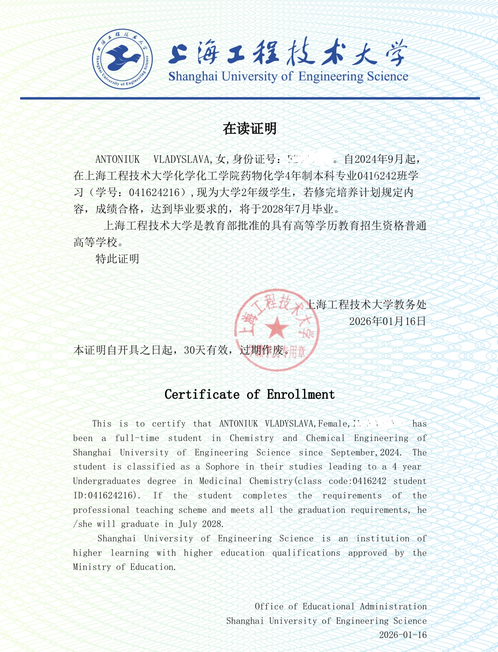 Сначала училась на языковых курсах в 上海工程技术大学, а сейчас получаю там бакалавриат по специальности 药物化学 (фармацевтическая химия) — все предметы преподаются на китайском языке. То есть китайский для меня — это ежедневные лекции, презентации, общение и жизнь, а не только уроки.