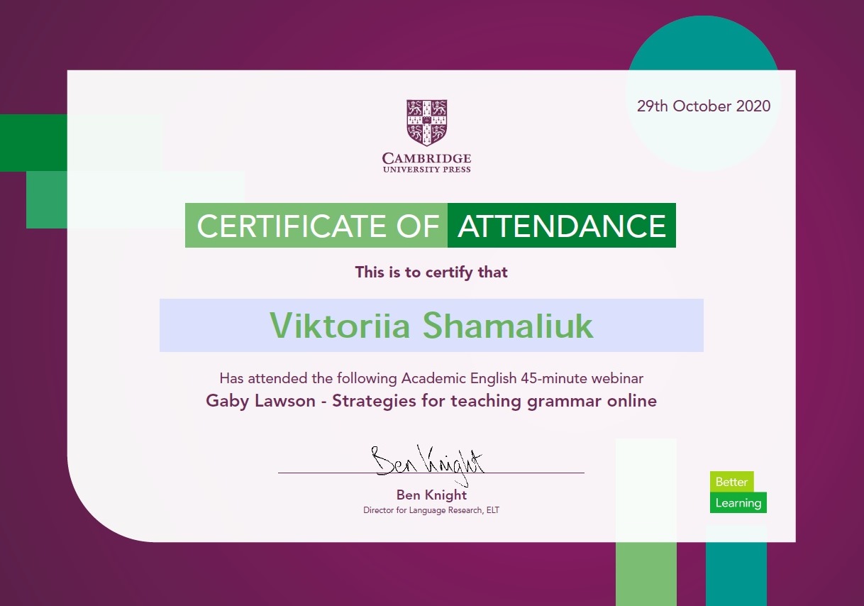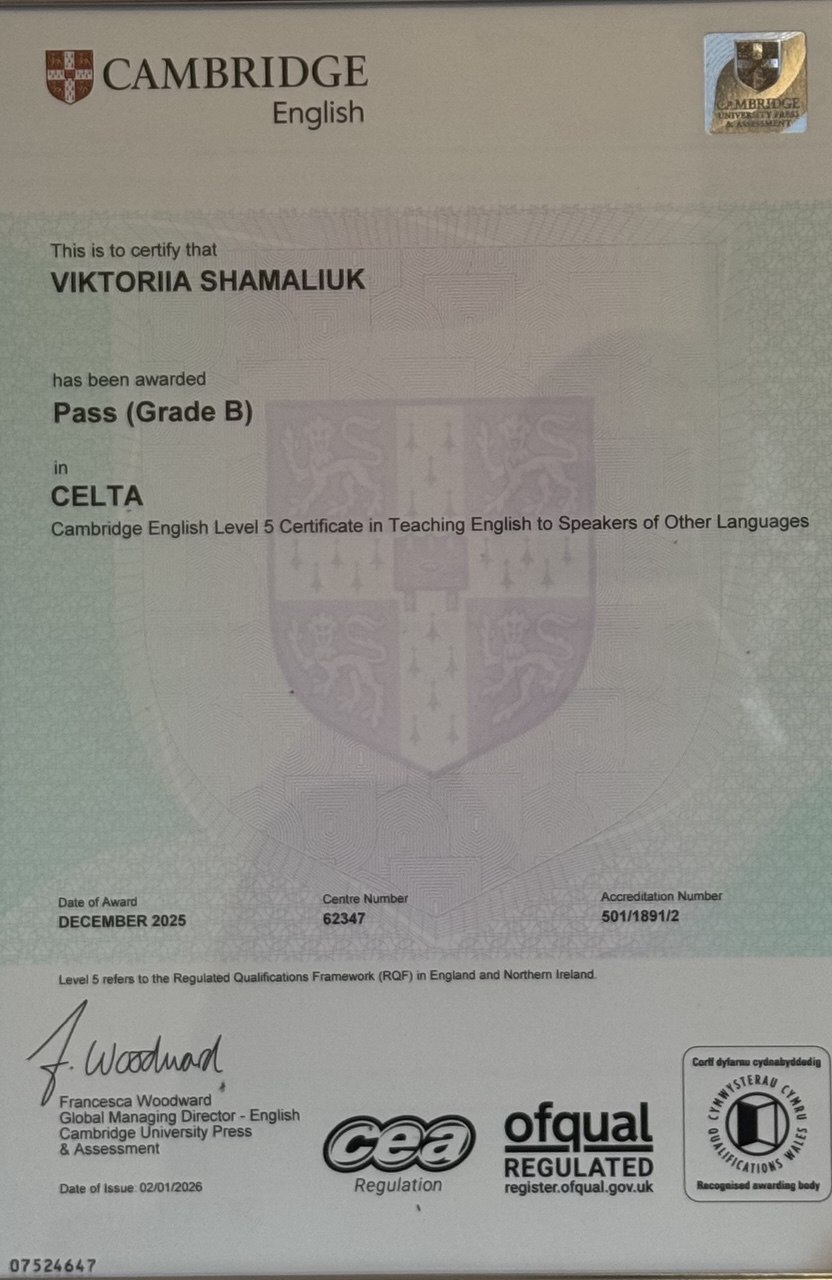 У меня международные квалификации CELTA (Оксфорд) и TESOL, а также более 10 лет опыта преподавания английского в Украине, Китае, Польше и Великобритании. Использую современные коммуникативные методики, обучаю живому, естественному языку с акцентом на уверенное общение, правильное произношение и практическое применение знаний. Обучение строю индивидуально, структурировано и со стратегией достижения конкретных целей: подготовка к международным экзаменам, собеседованиям, профессиональной коммуникации. Постоянно повышаю квалификацию, посещая вебинары и семинары, а жизнь в англоязычных странах помогла глубоко понять потребности студентов. Мои ученики успешно сдают экзамены, уверенно общаются на английском и получают удовольствие от обучения без стресса.