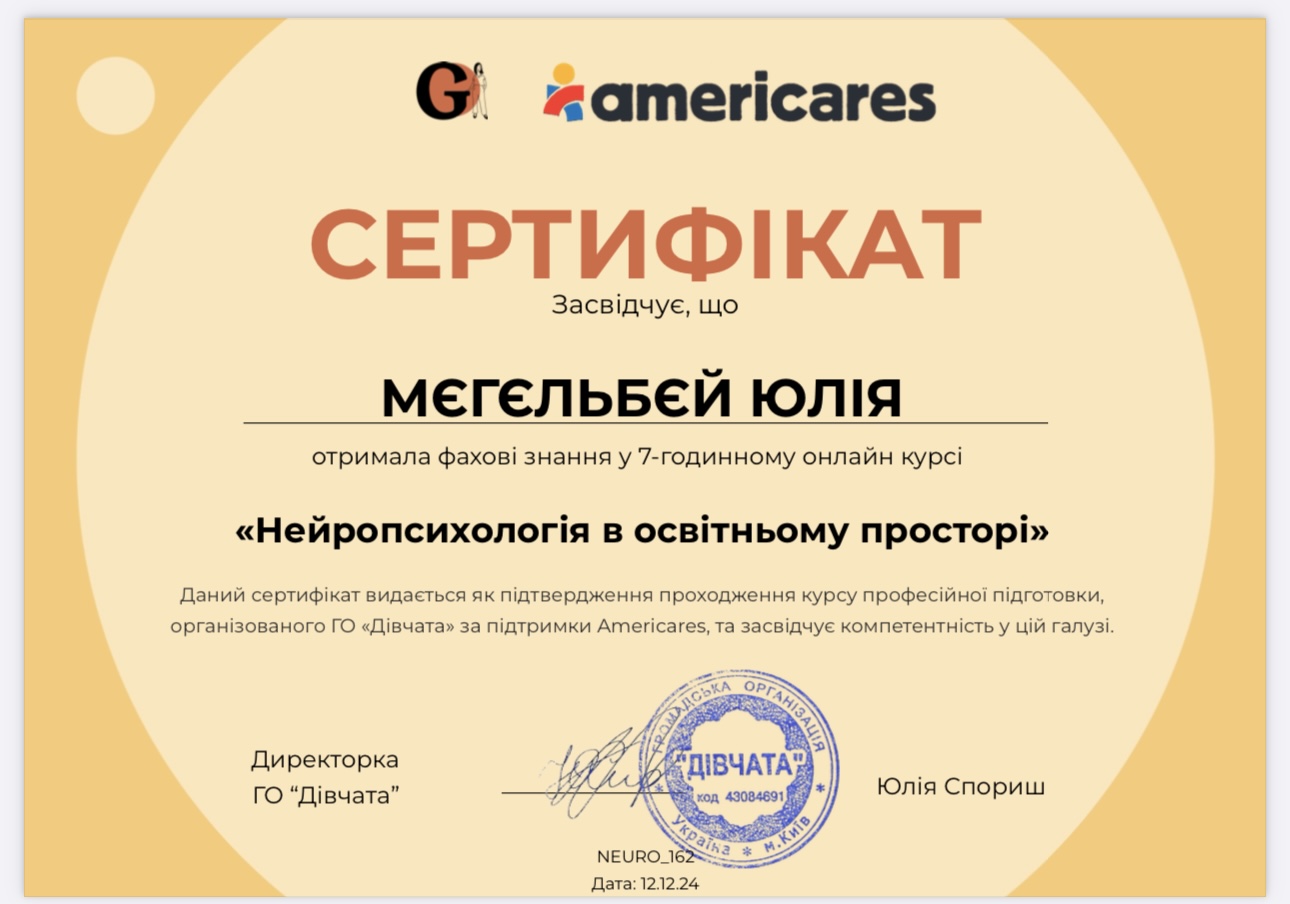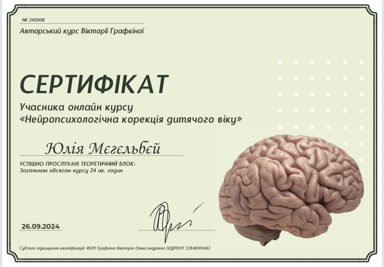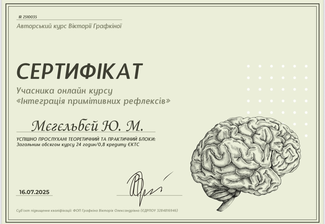 В 2025 году закончила Национальный медицинский университет имени О.О. Богомольца. Магистр «Терапия и реабилитация». Работаю в нейрокоррекционном и сенсомоторном подходе.