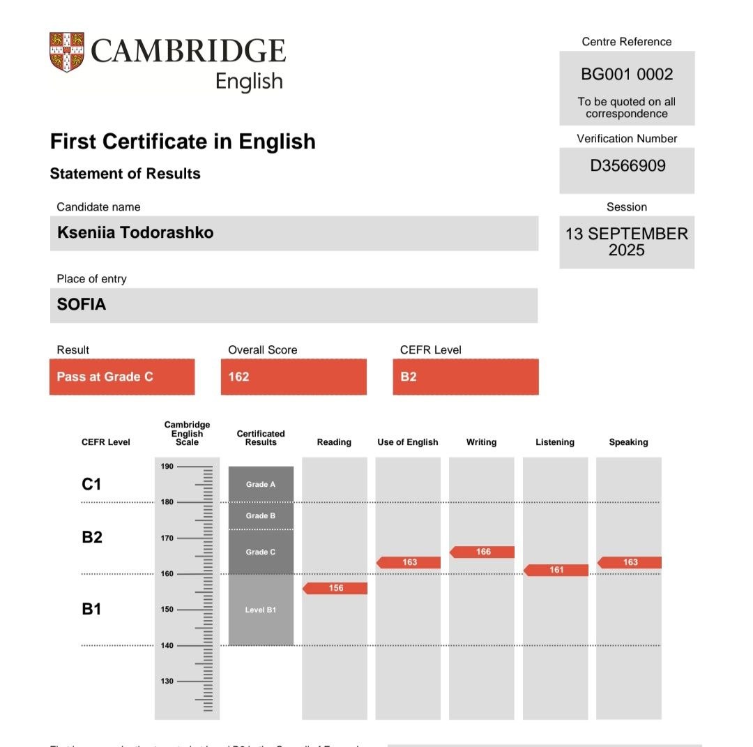 У меня есть сертификат FCE (B2) 📄 Я готовилась к нему 2 месяца и продолжаю совершенствовать уровень. Сейчас двигаюсь к C1 📈 Часто путешествую и использую английский в реальной жизни, поэтому знаю, как важно не просто знать правила, а уметь говорить и понимать язык на практике. Работаю с современными материалами (EngHub, Speakout, Destination и другими)