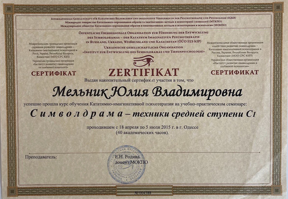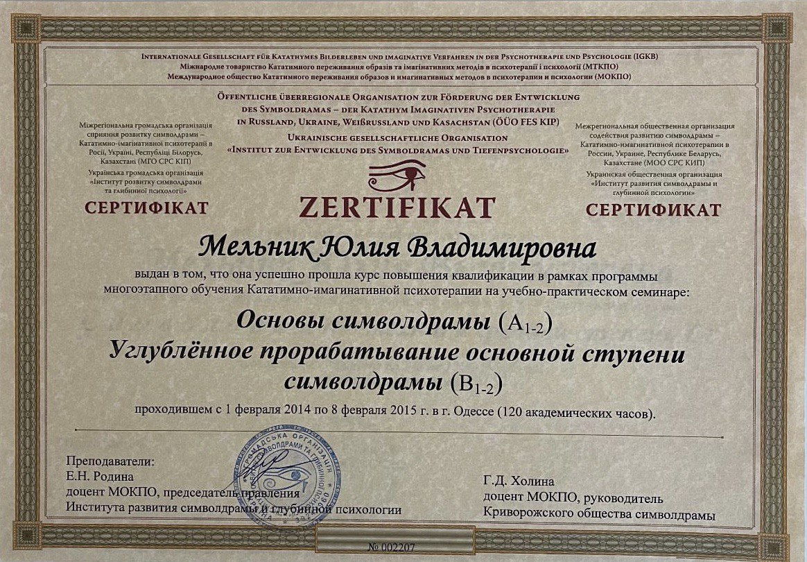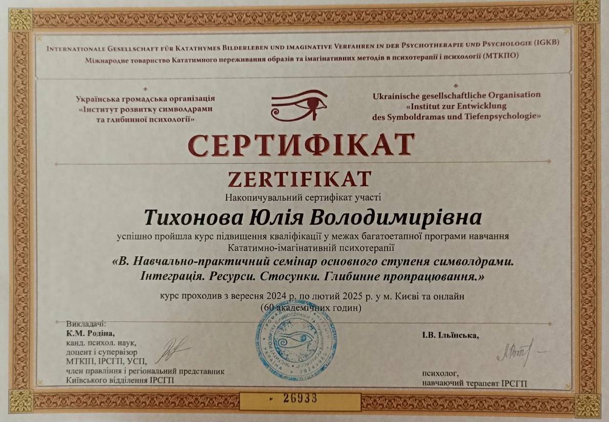 Я являюсь ассоциированным членом Украинской общественной организации «Институт развития символдрамы и глубинной психологии» (ИРСГП), принимаю участие в психотерапевтических мероприятиях института. Имею опыт личной и групповой психотерапии. Регулярно принимаю участие в интервизиях и супервизиях.