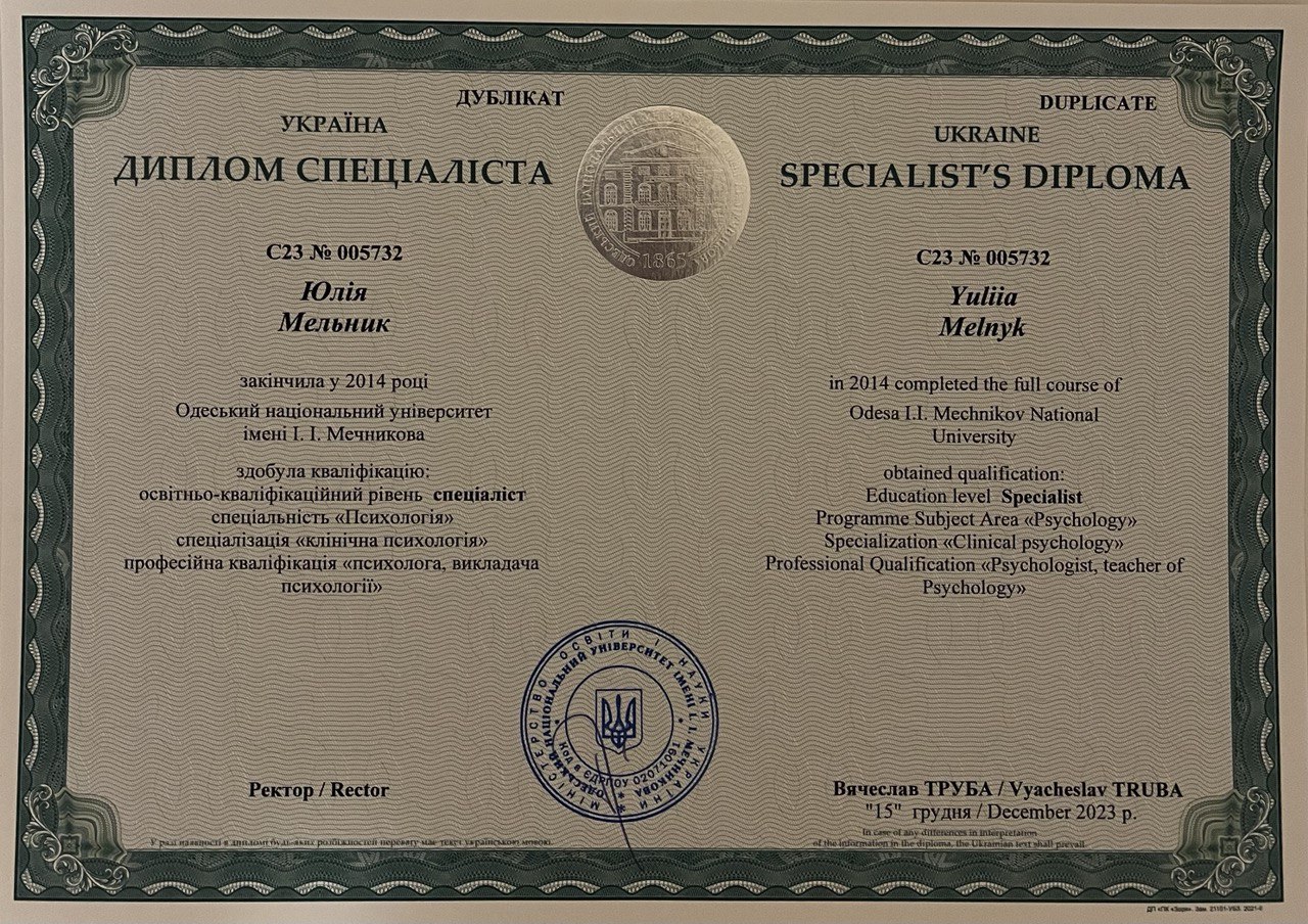 Закончила Одесский национальный университет имени И. И. Мечникова, специализация «клиническая психология», 2014 г., С23 № 005732. Диплом специалиста.