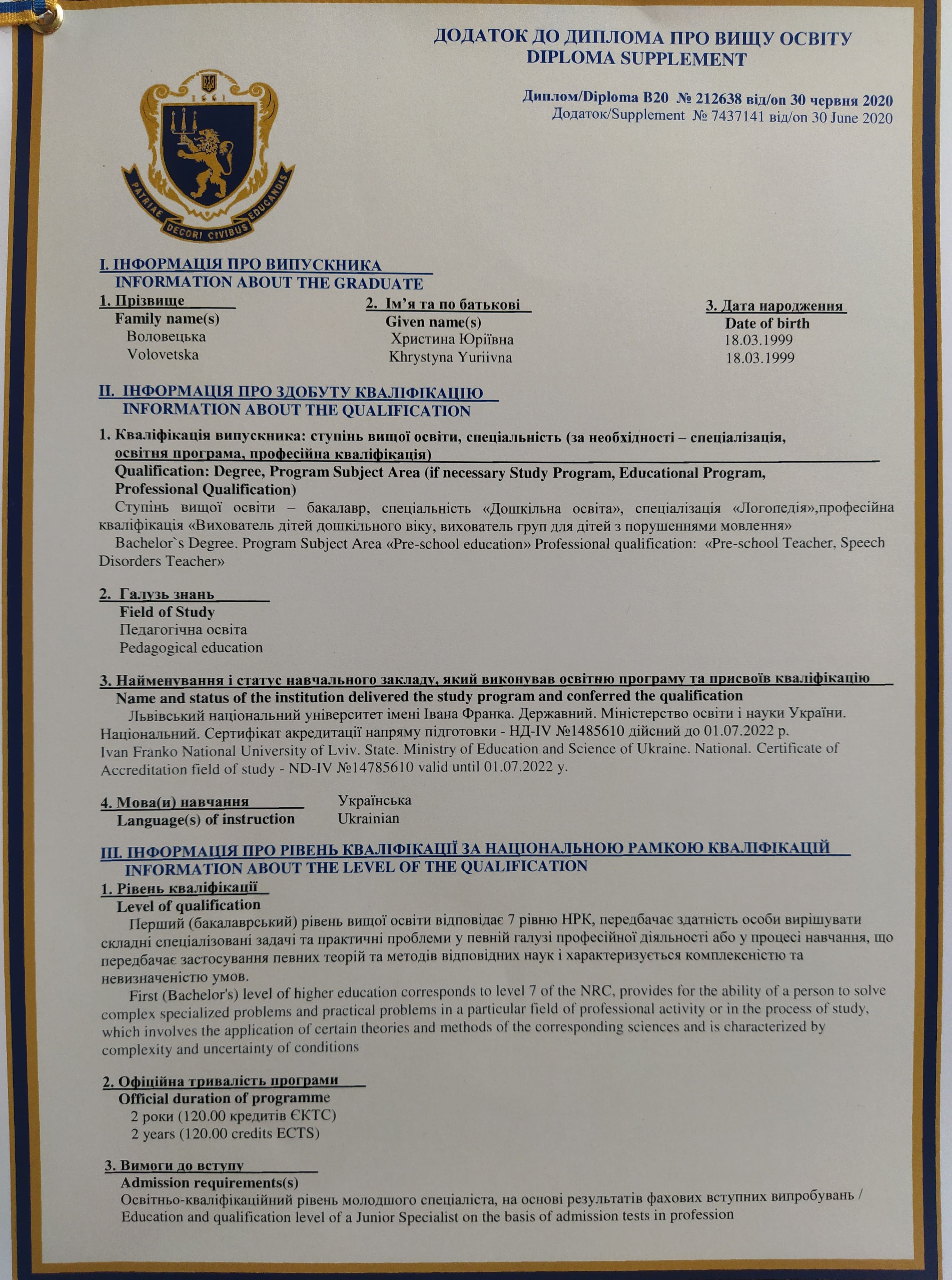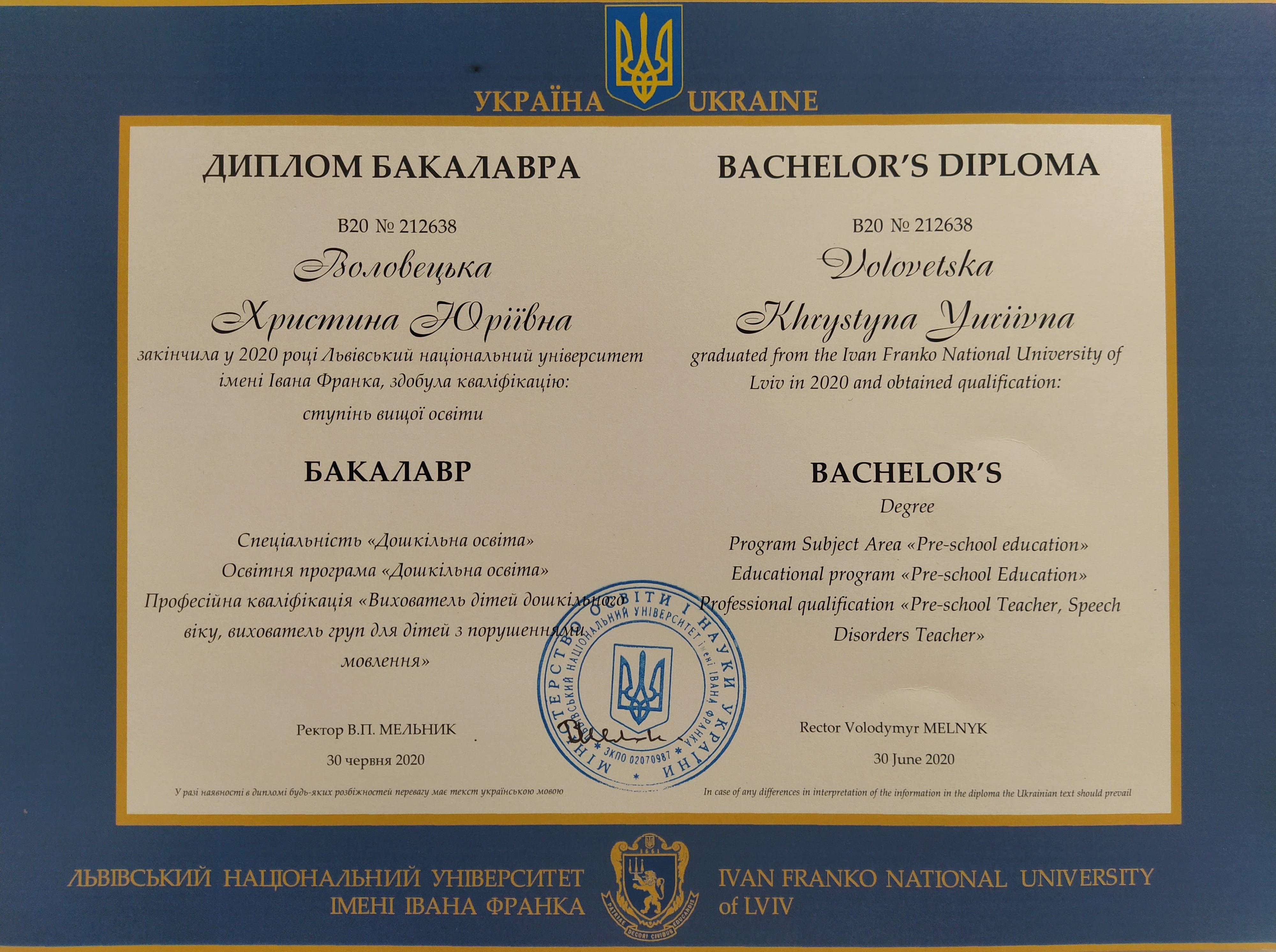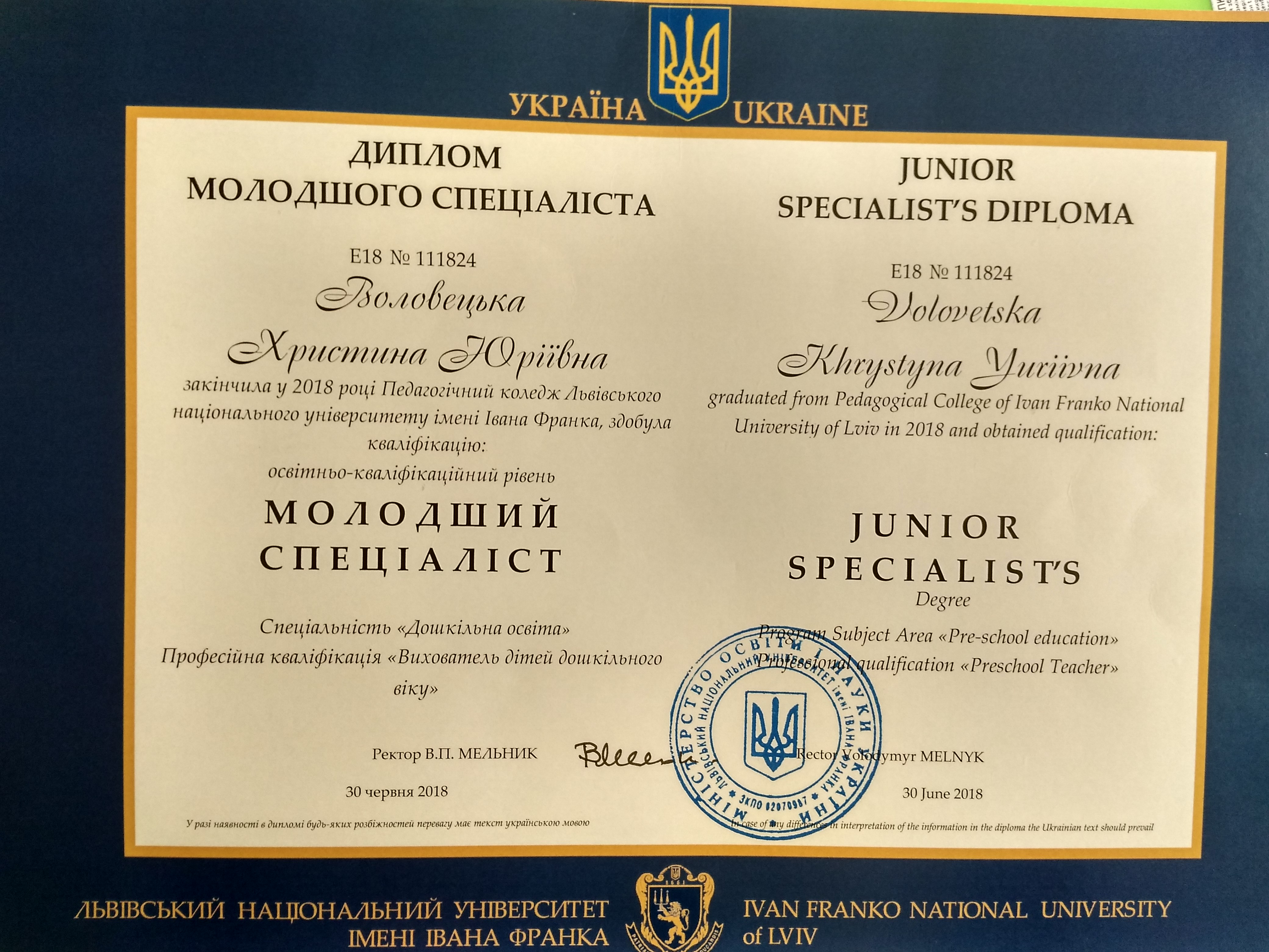 В 2022 году закончила обучение в GreenForest на уровень C1 (Advanced). В 2020 году участвовала в англоязычном лагере WhoCamp от EnglishWho. В этом же году окончила обучение на Педагогическом факультете в ЛНУ им. Ивана Франко, получила образовательно-квалификационный уровень 'бакалавр'. Предварительно в 2018 году окончила Педагогический колледж ЛНУ им. Франко, где получила образовательно-квалификационный уровень 'младший специалист'. Имею большой опыт преподавания английского детям младшего и среднего школьного возраста. Использую современные обучающие методы и индивидуальный подход к каждому ребенку.