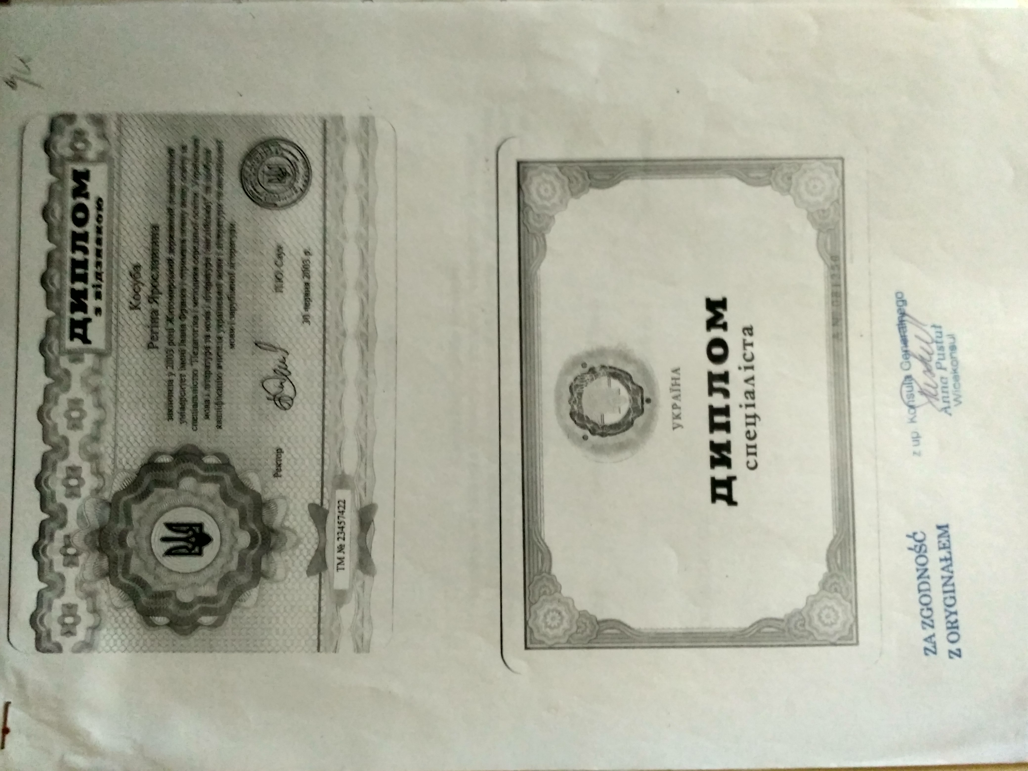 Получила послевузовское образование в Университете Марии Кюри-Склодовской, Люблин, Польша - польская филология и история, а также в Житомирском государственном университете - филологический факультет - учитель.