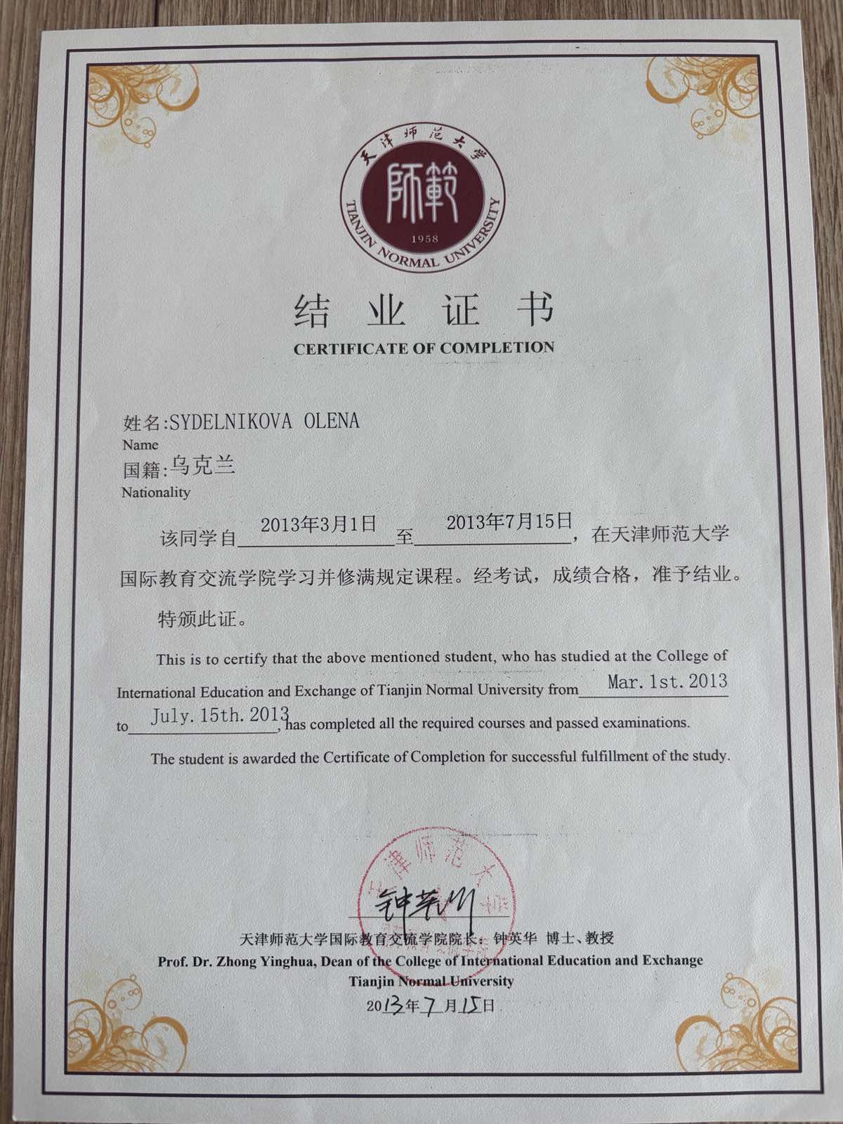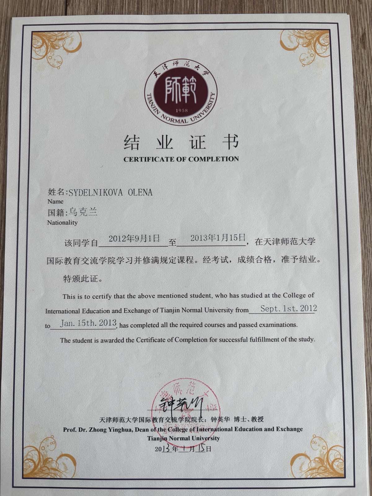 Языковые курсы 天津师范大学 (г. Тяньцзин, КНР, 1 год, 2012-2013 гг.).