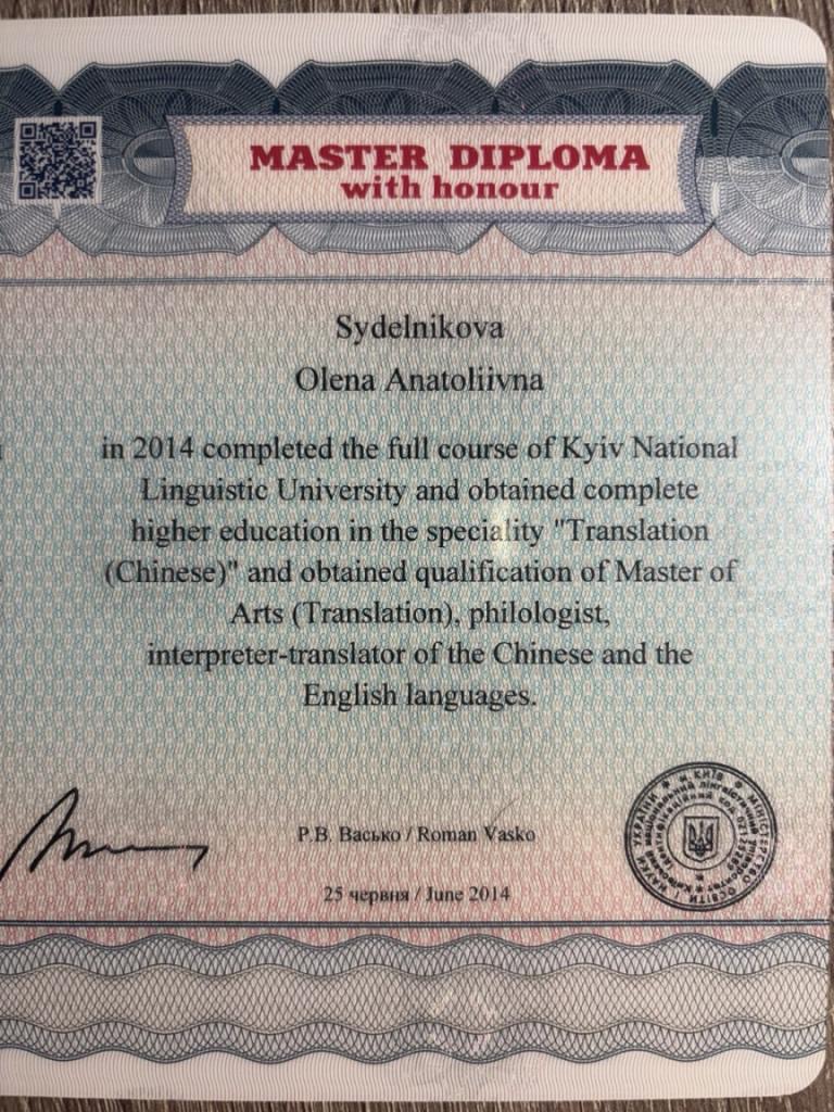 Образование: КНЛУ, факультет востоковедения, квалификация – переводчик китайского и английского языков, магистр филологии, диплом с отличием (2014 г.).