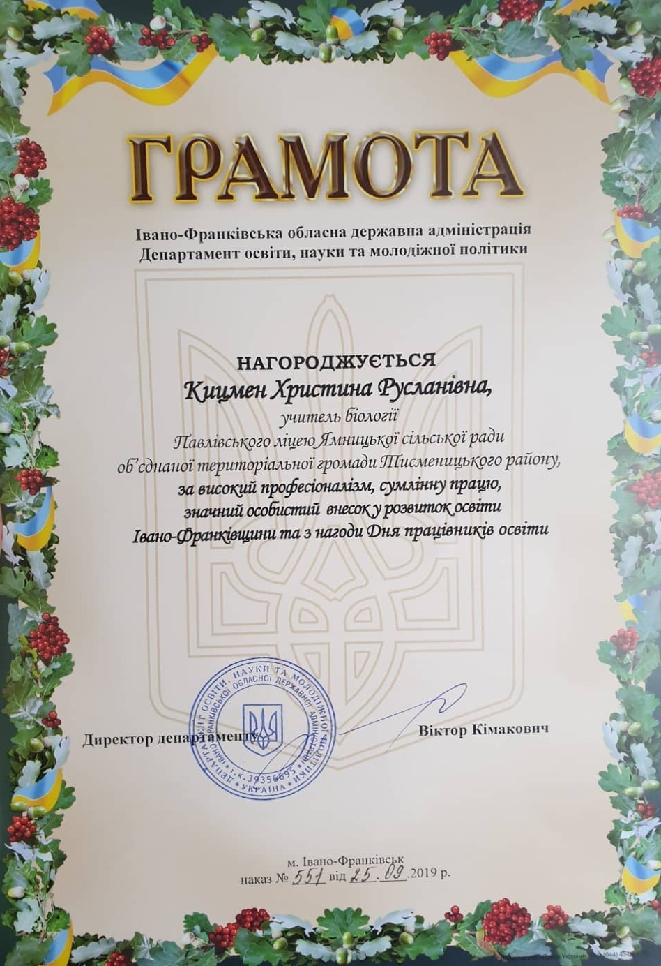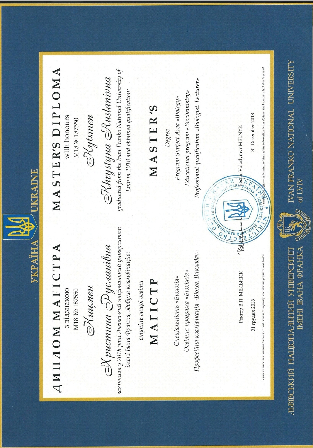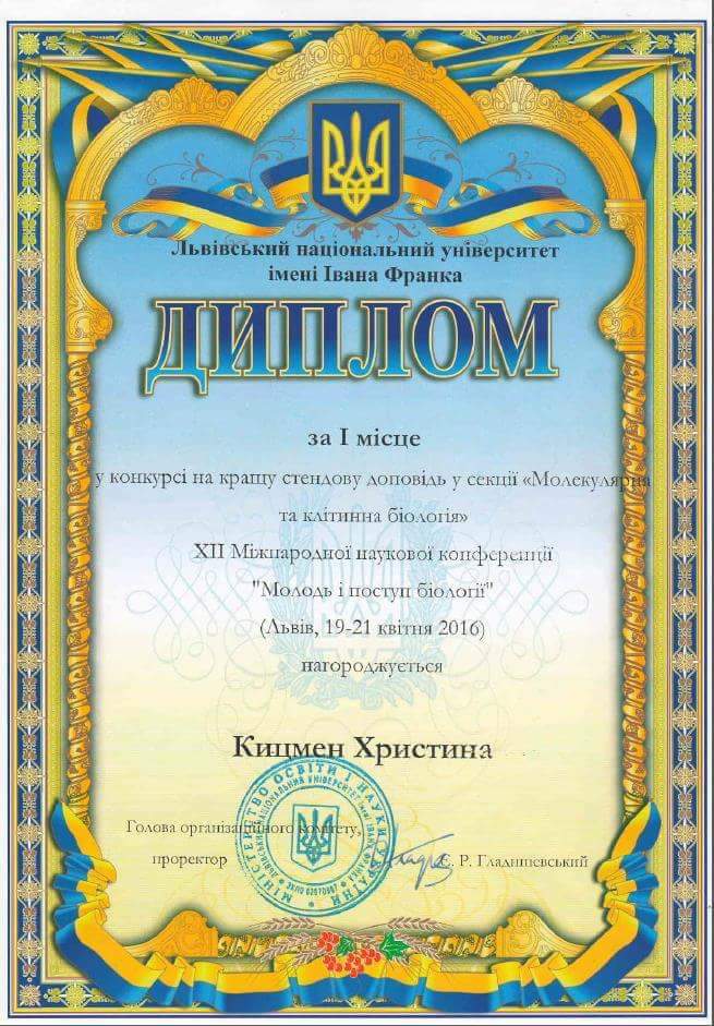 В прошлом призер олимпиад по биологии и экологии, призер конкурса-защиты научно-исследовательских работ учащихся-членов МАН, индивидуальный опыт сдачи ВНО по биологии 2013 год – 198 баллов, 2015 год – 199 баллов.