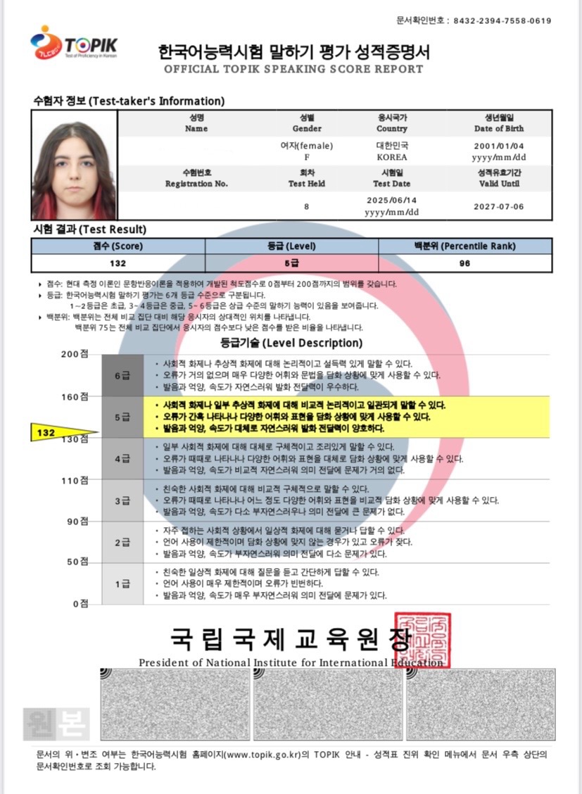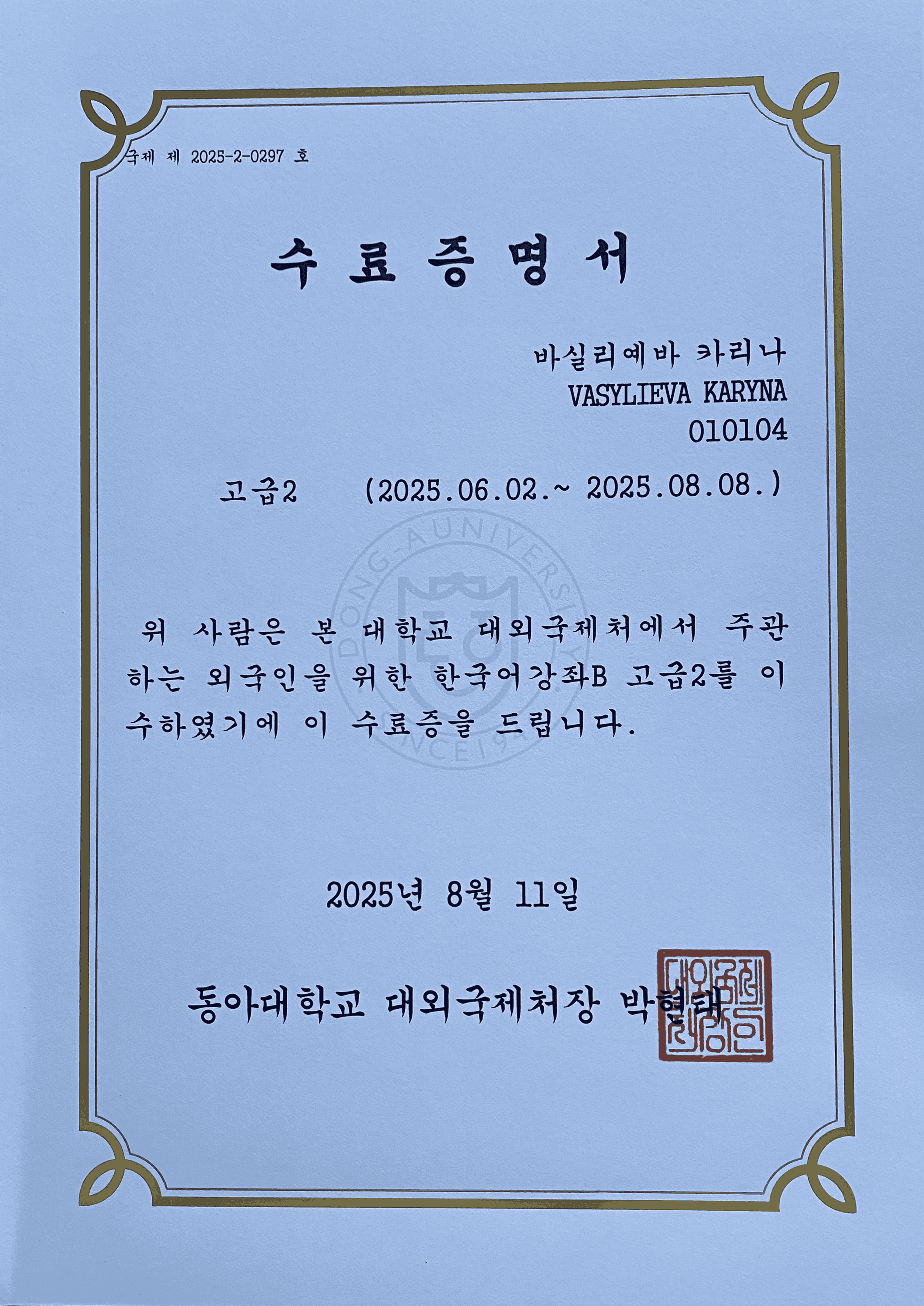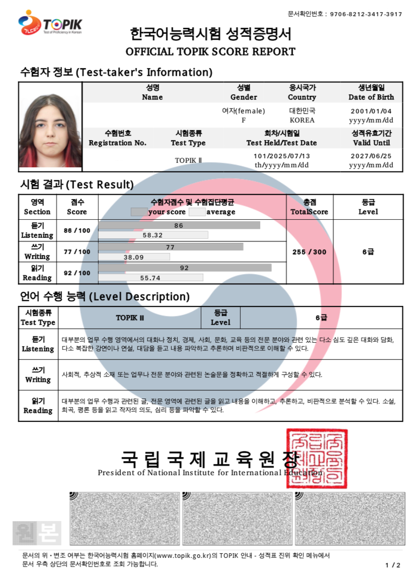У меня подтвержден 6 уровень по экзамену ТОПИК, а также успешная сдача ТОПИКА по говорению на 5 уровень. Училась и продолжаю учиться с носителями языка, поэтому могу рассказать о языке и культуре, что вы не услышите от других преподавателей. Кроме того, в 2024 г. я получила грант от правительства Республики Корея и в течение года жила и училась на языковых курсах в самой Корее!