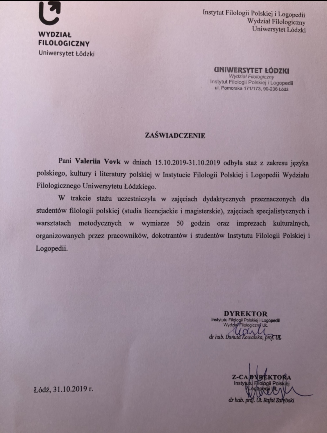 Изучала польский язык в ХНУ им. В. Н. Каразина, специальность - Польская филология. В течение трех лет имела возможность совершенствовать польский язык в Люблине (университет Марии Кюри-Склодовской) во время летней школы для иностранцев. Несколько раз проходила стажировку в Лодзи от ХНУ им. Каразина.