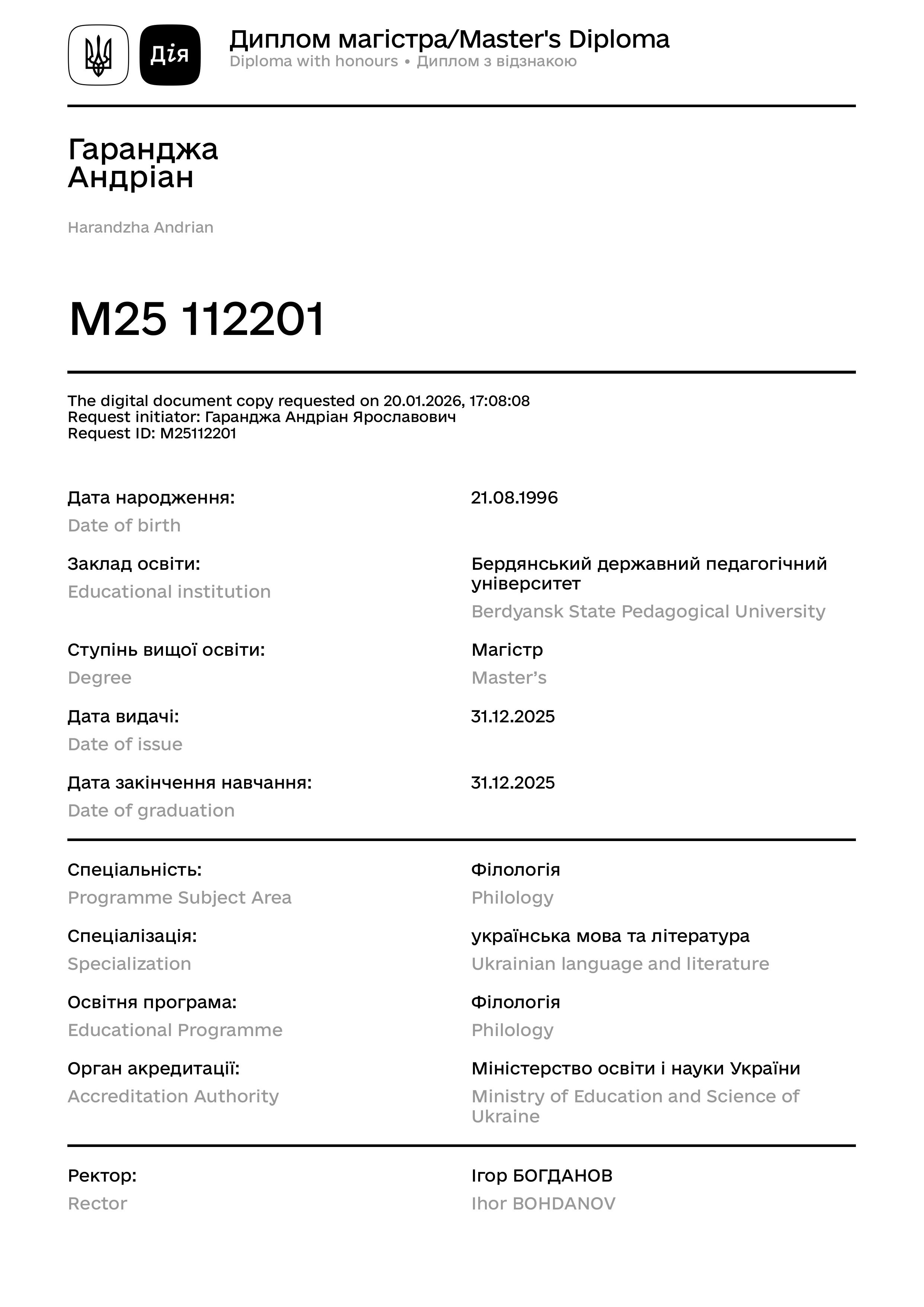 Окончил Украинский Католический Университет (2020), Бердянский государственный педагогический университет (2025). Требователен в обучении, использую различные методы объяснения. Есть опыт работы с детьми украинской диаспоры.