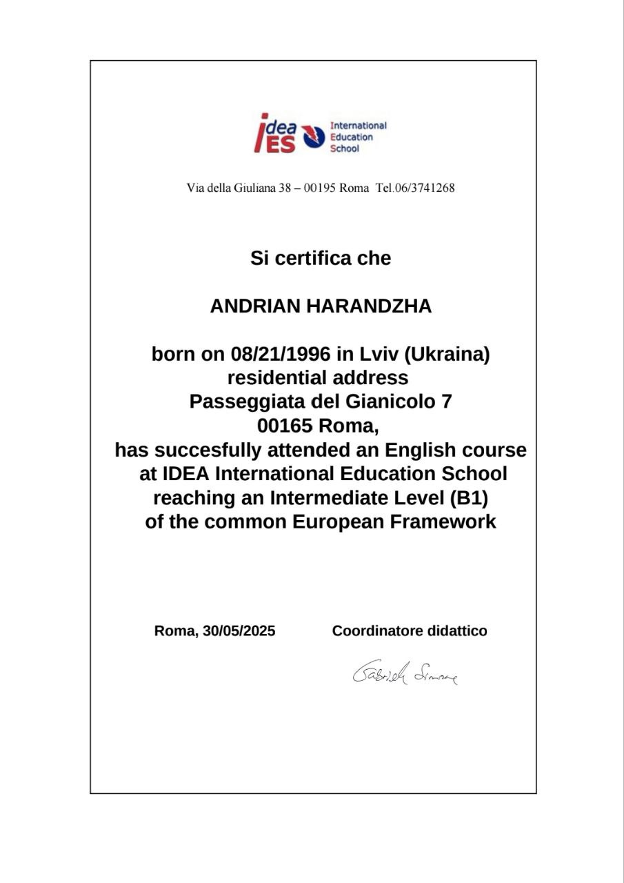 Окончил Украинский Католический Университет (2020), Григорианский университет (г. Рим, 2024). Индивидуально готовлюсь в соответствии с потребностями каждого.