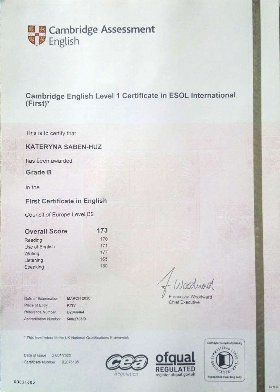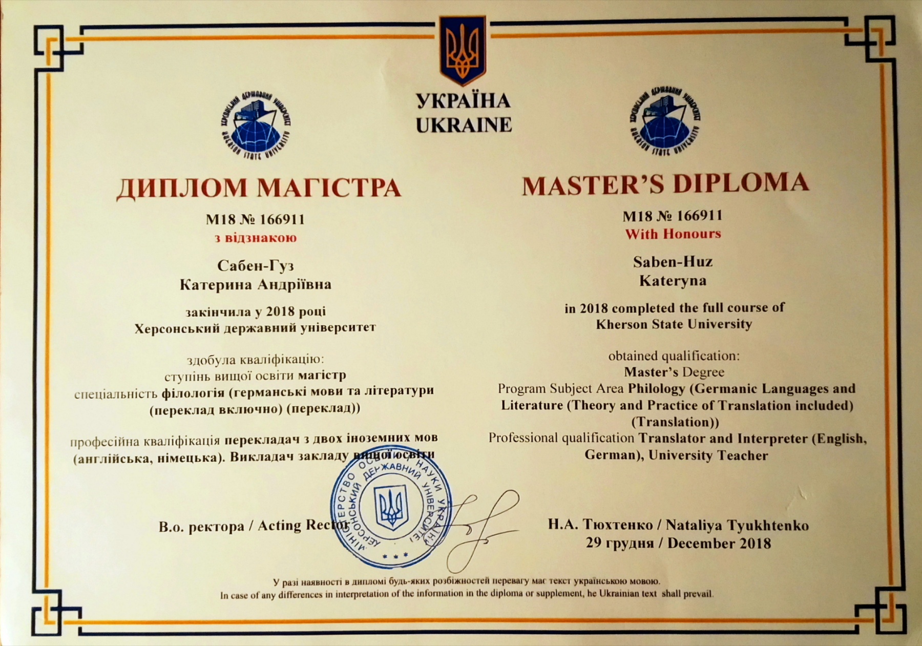 Имею диплом переводчика (с отличием). Окончила Херсонский государственный университет по специальности "филология (германские языки и литература (перевод включительно (перевод))). Проф. квалификация: переводчик с двух иностранных языков (англ, нем).
