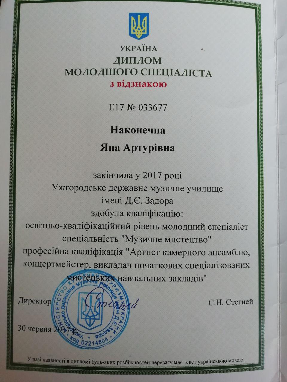 Завершила УжГМУ им. Д. Е. Задора как пианистка, завершила бакалавриат НМАУ им. П, И. Чайковского по специальности "Композиция". 3 года преподавала в музыкальной школе в Крюковщине, 1 год преподавала сольфеджио и музыкальную литературу в музыкальной школе номер 6 города Киев. Сейчас преподаю фортепиано Ужгородской школе искусств. Очень люблю детей, поэтому с удовольствием их научу их (а также взрослым) всем известным мне тонкостям игры на фортепиано)))