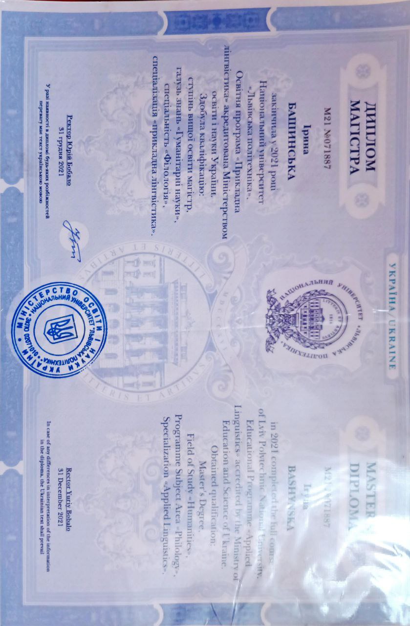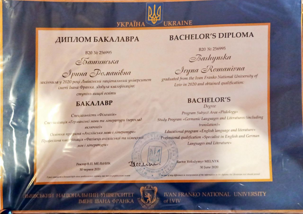 Недавно окончила ЛНУ им. Франко, факультет иностранных языков, специальность английская филология. Завершила языковые курсы в Goethe-Institut во Львове, также есть языковой сертификат TestDAF (TDN 4).