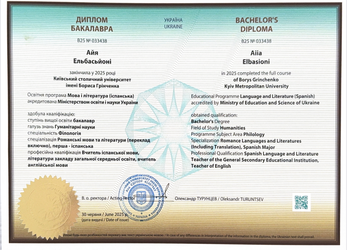Мене звати Айя, я дипломований філолог іспанської та англійської мов із відмінними оцінками. Брала участь у програмі Erasmus+, навчалася та проживала в Іспанії, що дозволило мені глибше зануритися в мову та культуру. Також, намагаюся знайти до кожного підхід, щоб уроки були цікавими та інформативними.
