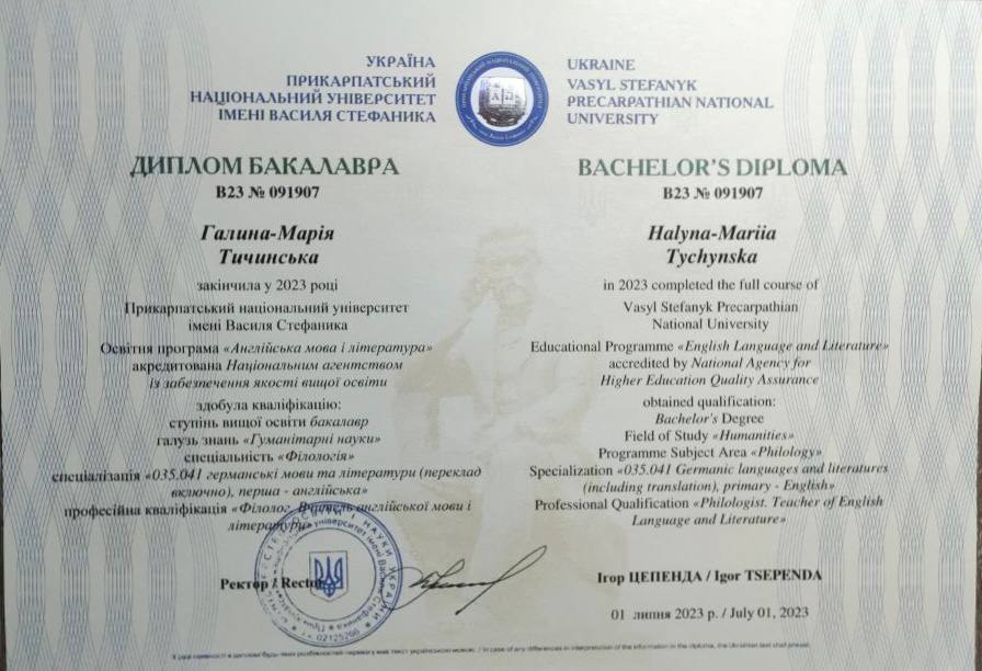 Я закінчила факультет іноземних мов Карпатського університету, спеціальність «Іноземна філологія» з перекладом (код спеціальності 035.041). Моя перша мова – англійська, тож я можу допомогти дітям освоювати мову природньо і ефективно.