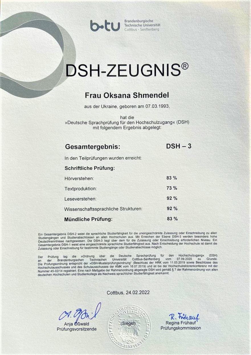 Закінчила мовний курс рівня академічний С1 в Бранденбурзькому технічному університеті.