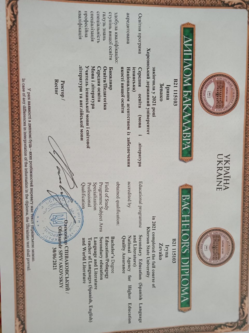 Дуже рада допомогти всім бажаючим поринути у світ іспанської мови та культури. Працюю з людьми будь-якого віку. Власна методика, багато наочності. Дуже чекаю на свої заняття.