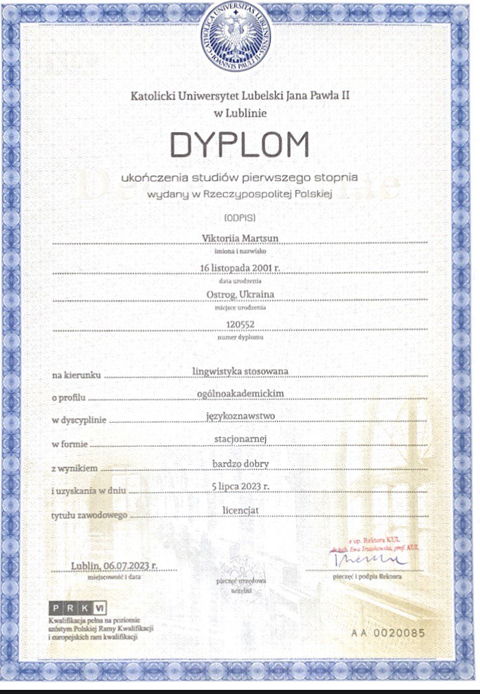 Доброго дня, я закінчила університет Католицького Люблінського Університету імені Іоана Павла ІІ. Вивчала Прикладну лінгвістику (англійська, польська та українські мови), крім того друга моя спеціальність -Глотодидактика (викладач польської мови). Тож дякуючи своїй освіті та перебуванню в Польщі, з впевненістю можу поділитися своїми знаннями з іншими, допомогти досягнути впевненого рівня А1-В1. Займалася репетиторством з дітьми шкільного віку та дорослими з різними цілями: розмовна мова, покращення граматики, підготовка до КП. В зв’язку з тим що проживала в Польщі та знаю загальні устрої держави , можу проконсультувати в своєму досвіті вступу в польські вищі навчальні заклади, та допомогти поступаючим підготуватись до першого року навчання, навчити не тільки польської мови, але й пояснити принципі роботи вищих навчальних закладів. Також, на даний момент працюю у фірмі, де активно використовую Польську мову щодня. Брала участь у робочих відрядженнях до Польщі, та успішно виконувала усі задачі зв’язані з польською.