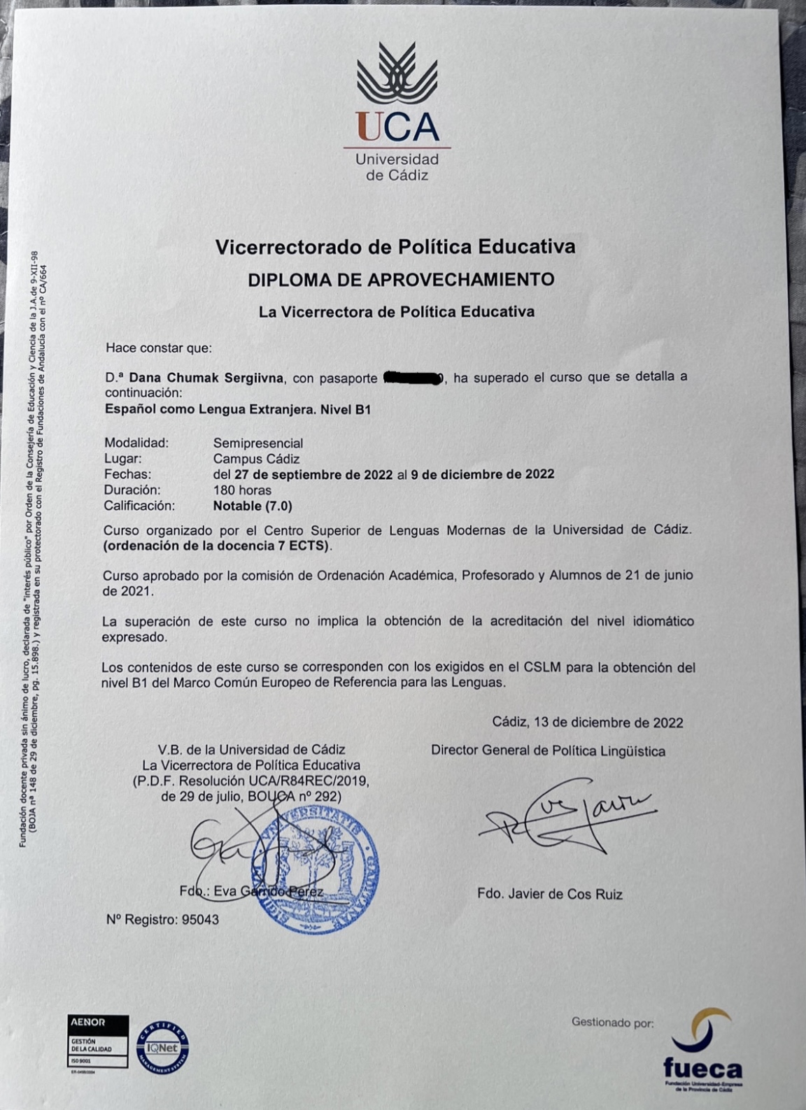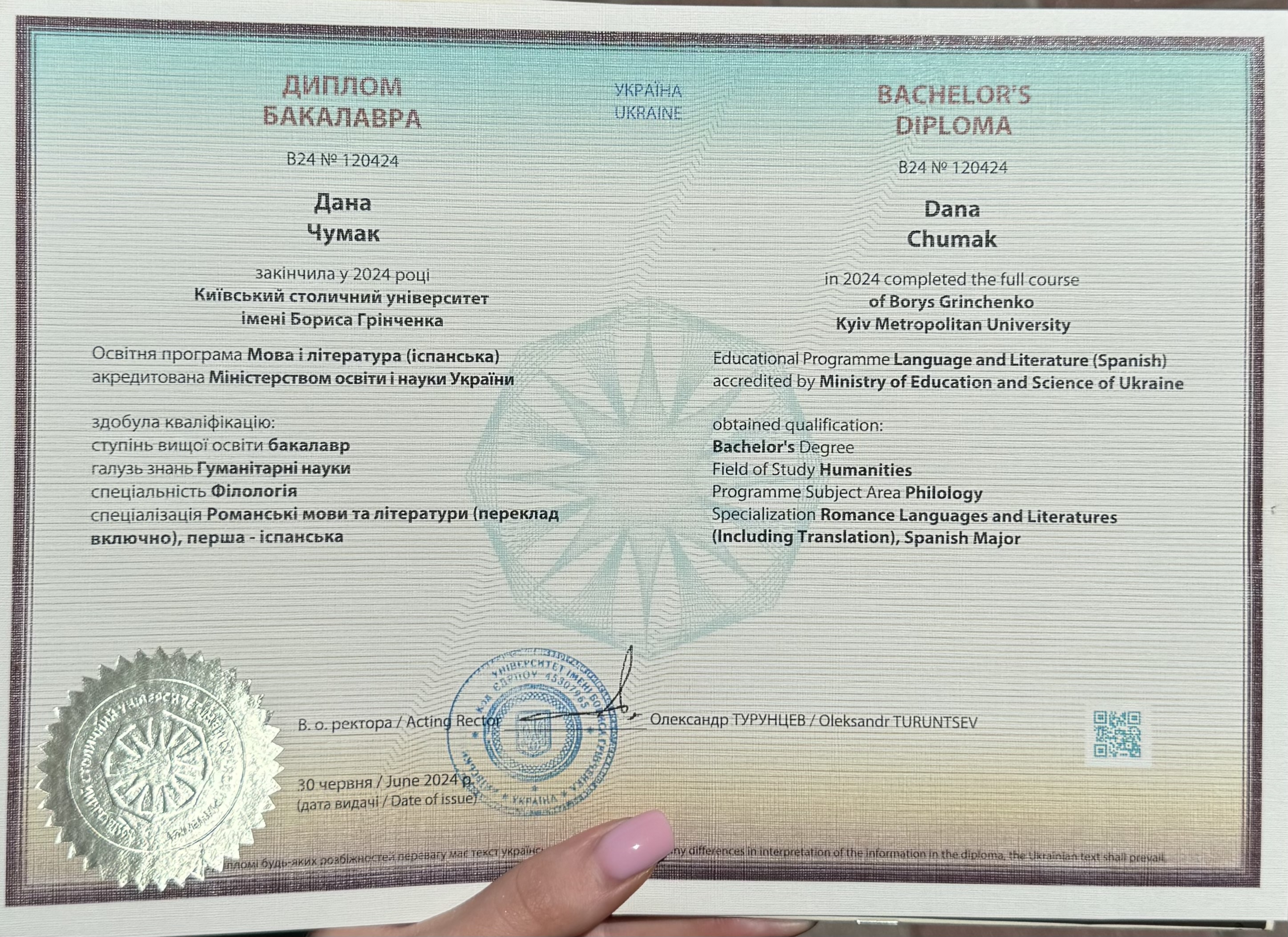 ¡Hola! Мене звати Дана, і я допомагаю полюбити іспанську мову з першого заняття! Закінчила університет за спеціальністю іспанська філологія, а також пів року навчалася в Іспанії, у місті Кадіс, en la Universidad de Filosofía y Letras. Саме там я відчула справжню іспанську — ту, яку чують і говорять щодня.