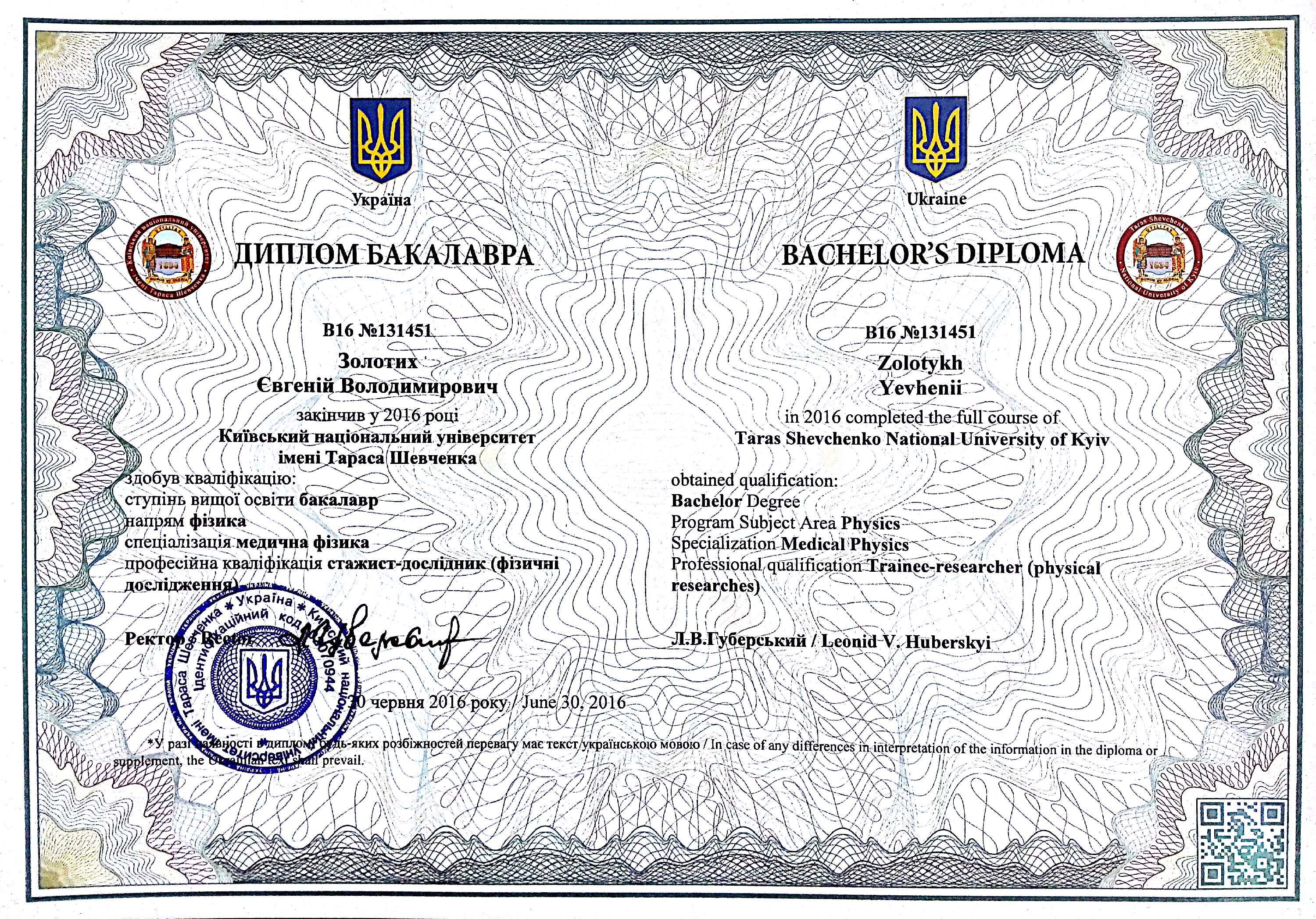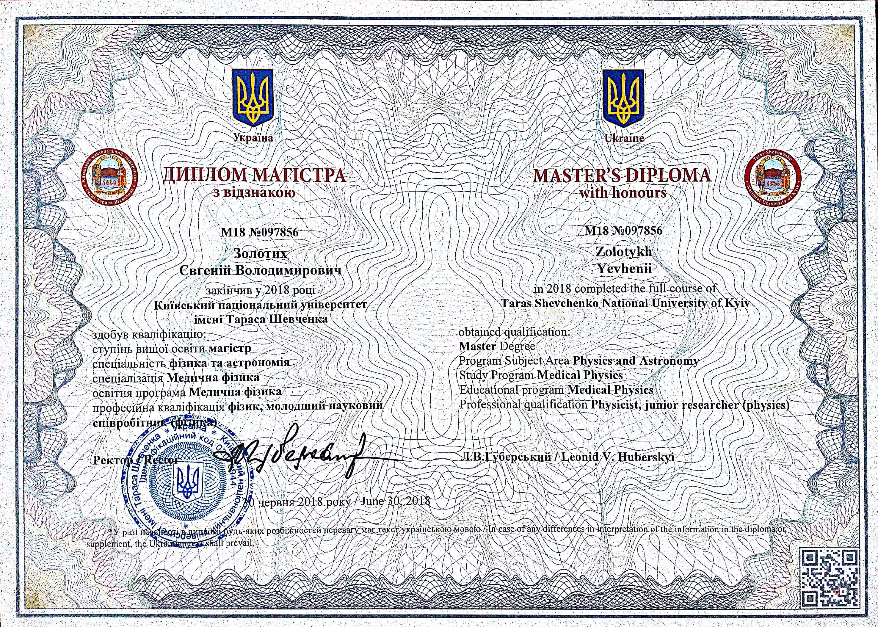 Освіта: Київський національний університет ім. Т. Шевченка, фізичний факультет, спеціальність "Медична фізика", диплом магістра (2018 р., з відзнакою), диплом бакалавра(2016 р.)