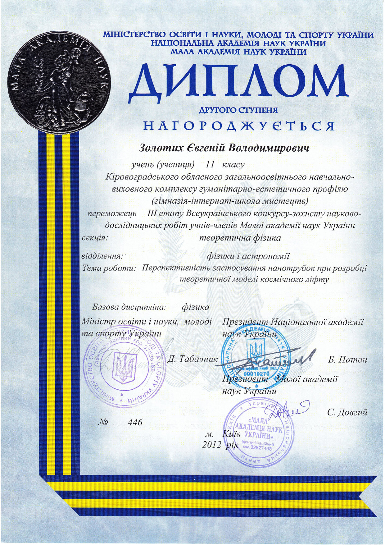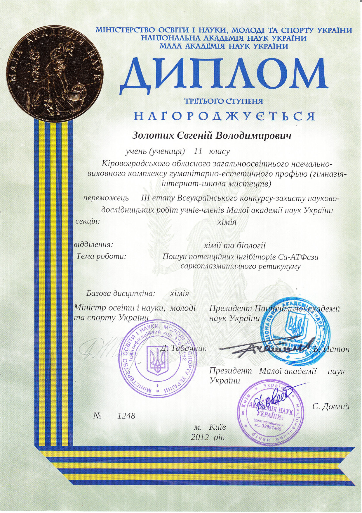 Відзнаки: Переможець Всеукраїнського етапу конкурсу-захисту МАН в секції "Теоретична фізика" (диплом 2-го ступеня) та в секції "Хімія" (диплом 3-го ступеня), 2012 рік; переможець обласних олімпіад по хімії, фізиці, біології, географії (2010-2012 роки)