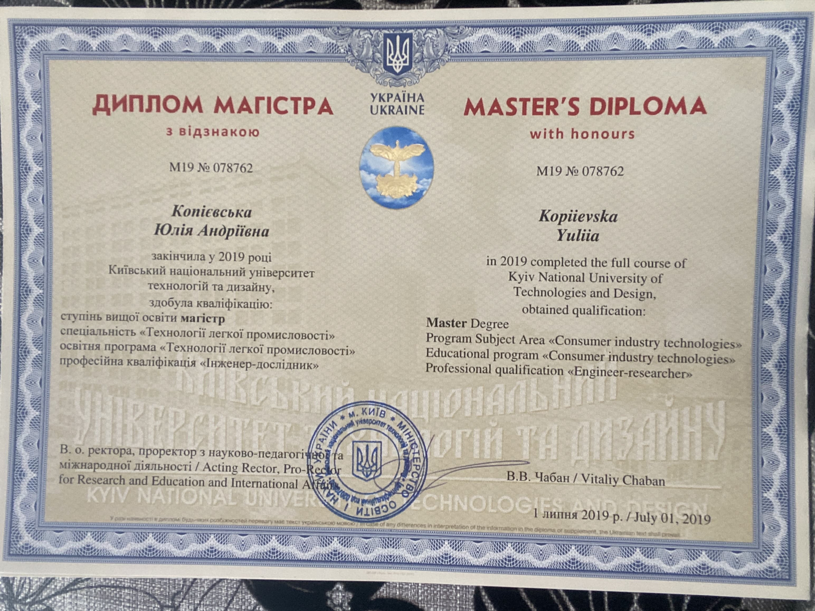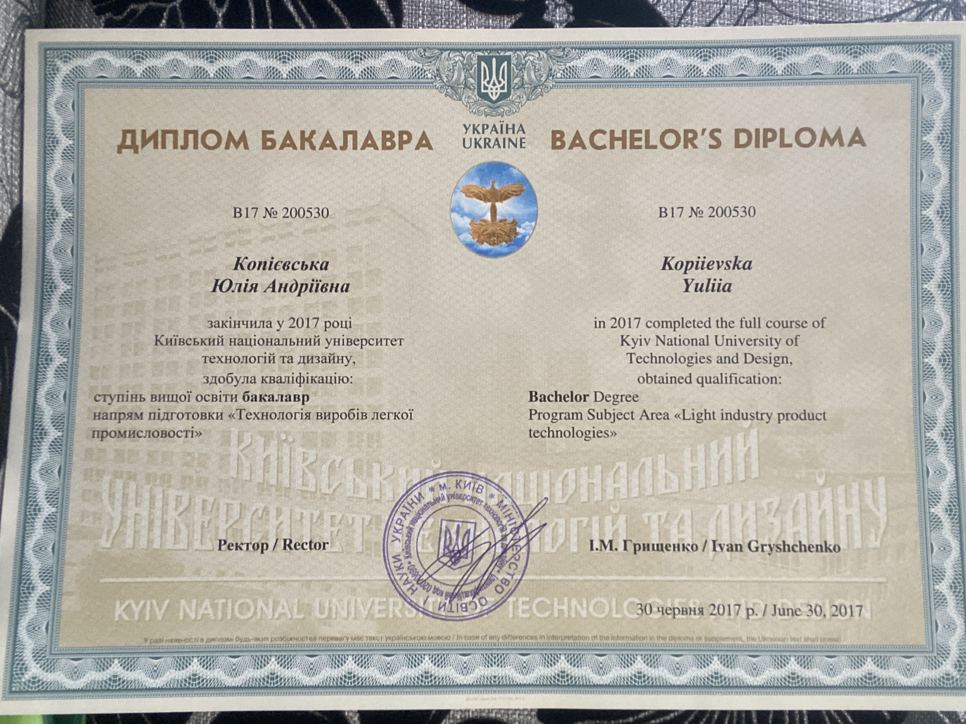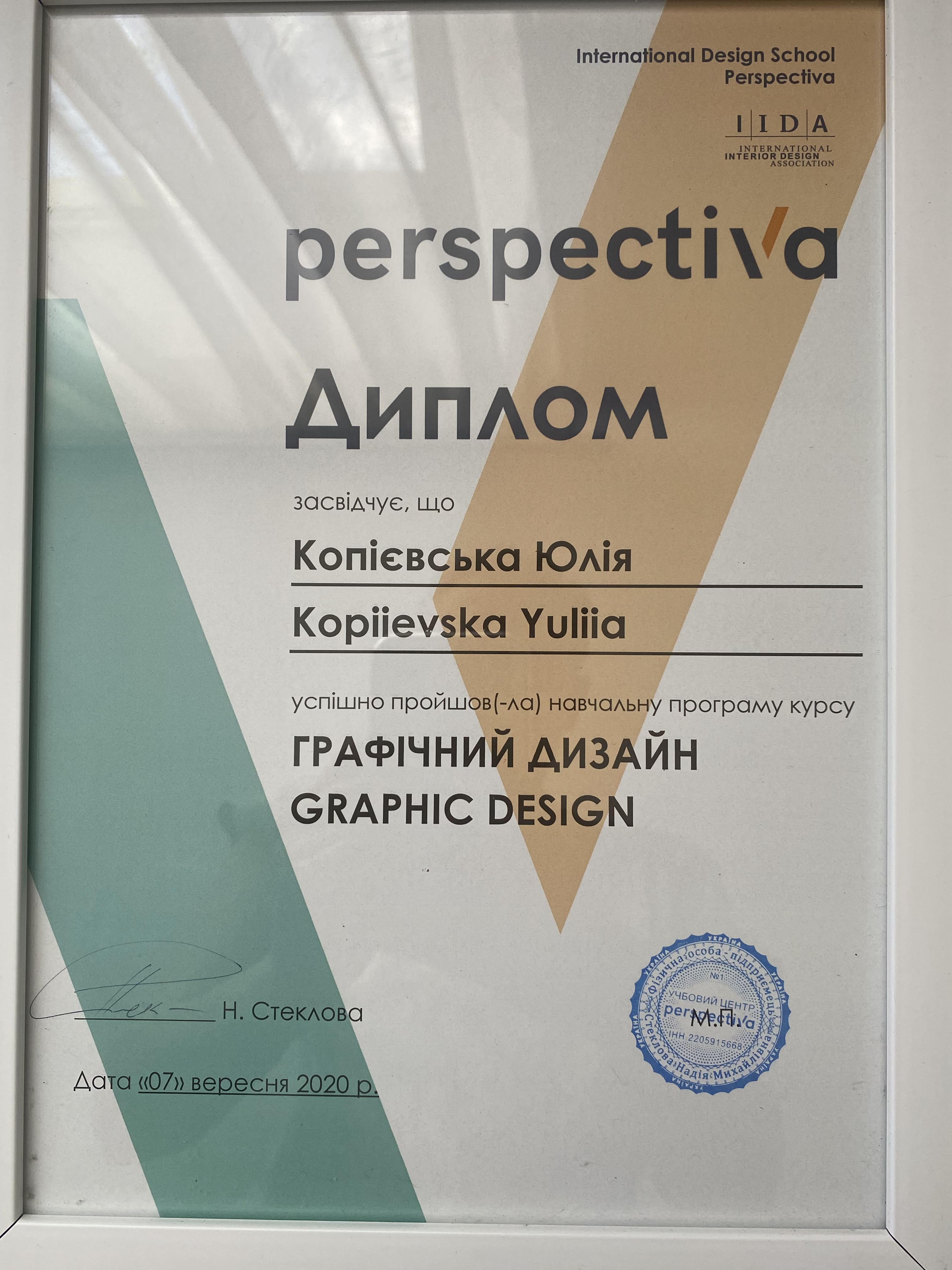 Закінчила 2018 році Київський національний університет технології та дизайну, пройшла курси графічного дизайну: композиції, освоєння програм та створення айдентики, займаюсь з ментором, підвищую кваліфікацію.