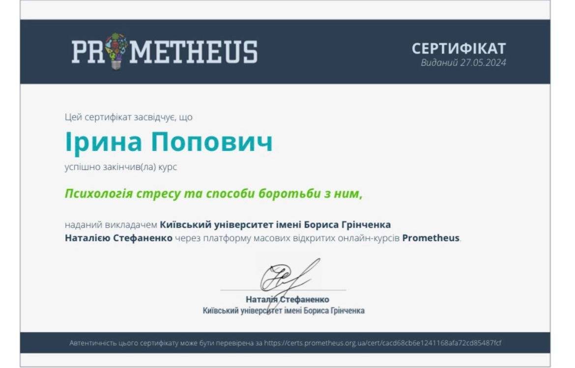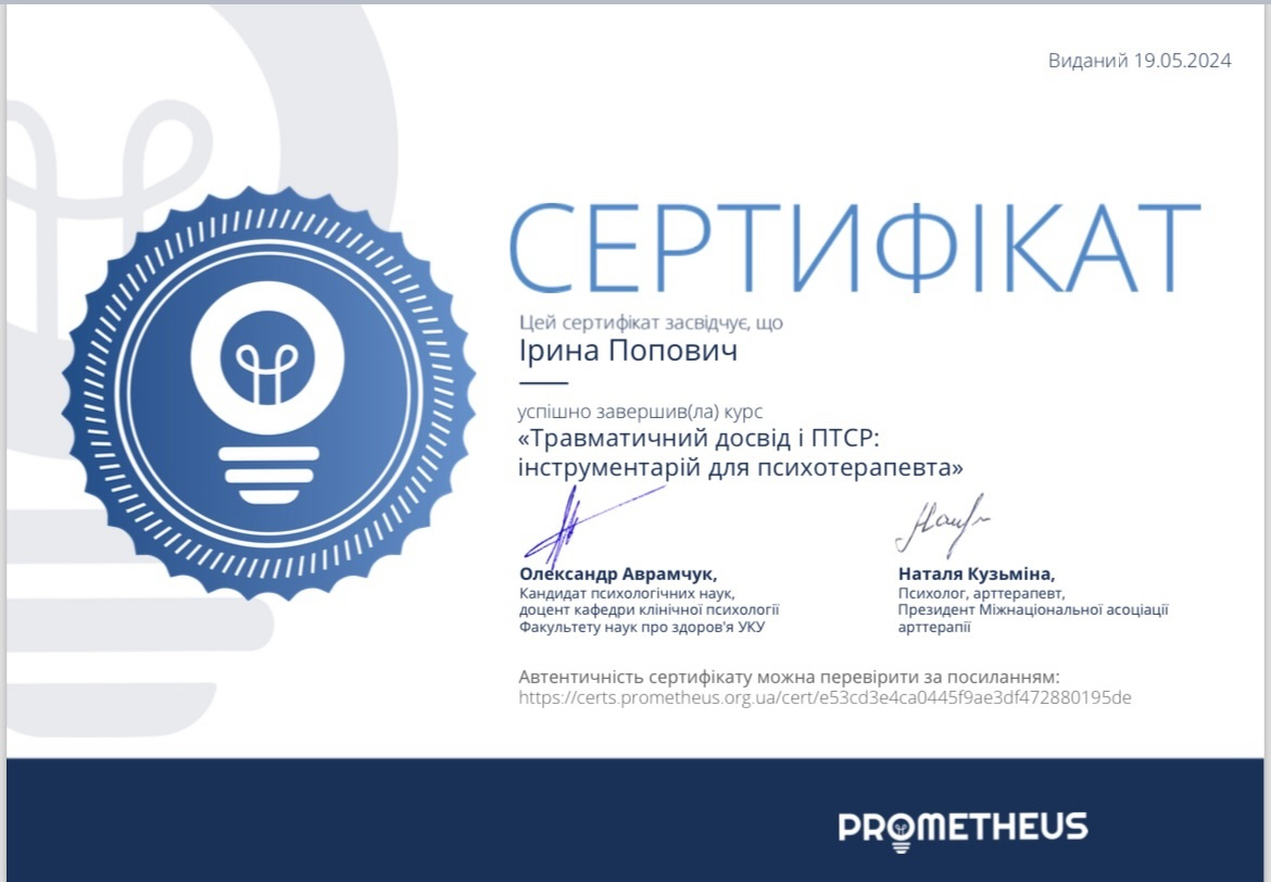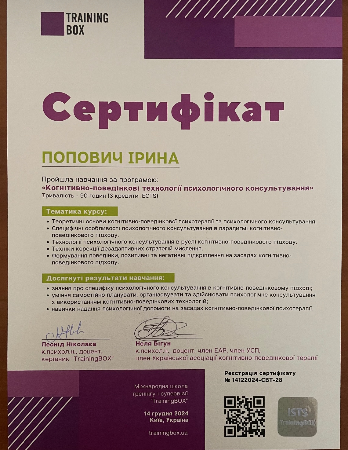 Мене звати Ірина, я практикуючий психолог. Основний напрям психотерапії - КПТ. Так як вона є науково доказовою і дає найшвидші результати. Також, залежно від запиту клієнта, застосовую максимально ефективний інтегративний підхід та коучингові техніки.