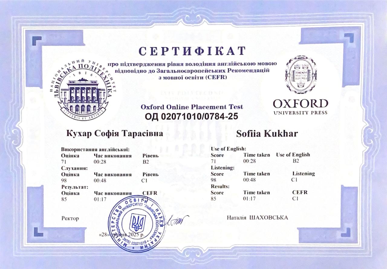 Викладання англійської мови — моє справжнє покликання. Маю понад три роки досвіду та велику кількість задоволених учнів. Працюю як з молодшими, так і зі старшими студентами, знаходжу індивідуальний підхід до кожного. Завжди використовую різноманітні матеріали та роблю уроки максимально інтерактивними. Добираю навчальні ресурси відповідно до рівня та цілей студента, щоб процес навчання був ефективним і цікавим. Також маю сертифікат Oxford Placement Test, що підтверджує мій рівень володіння англійською C1.