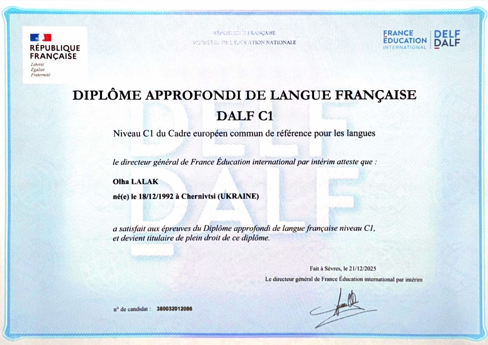 Маю 2 вищі освіти: диплом філолога французької мови та диплом викладача англійської мови. Маю підтверджений сертифікатом DALF рівень французької С1. Уже більше 10 років успішно працюю з молодшими учнями, учнями середньої ланки та дорослими. Успішно готую до різного роду іспитів з французької мови, в тому числі DELF A1-B2