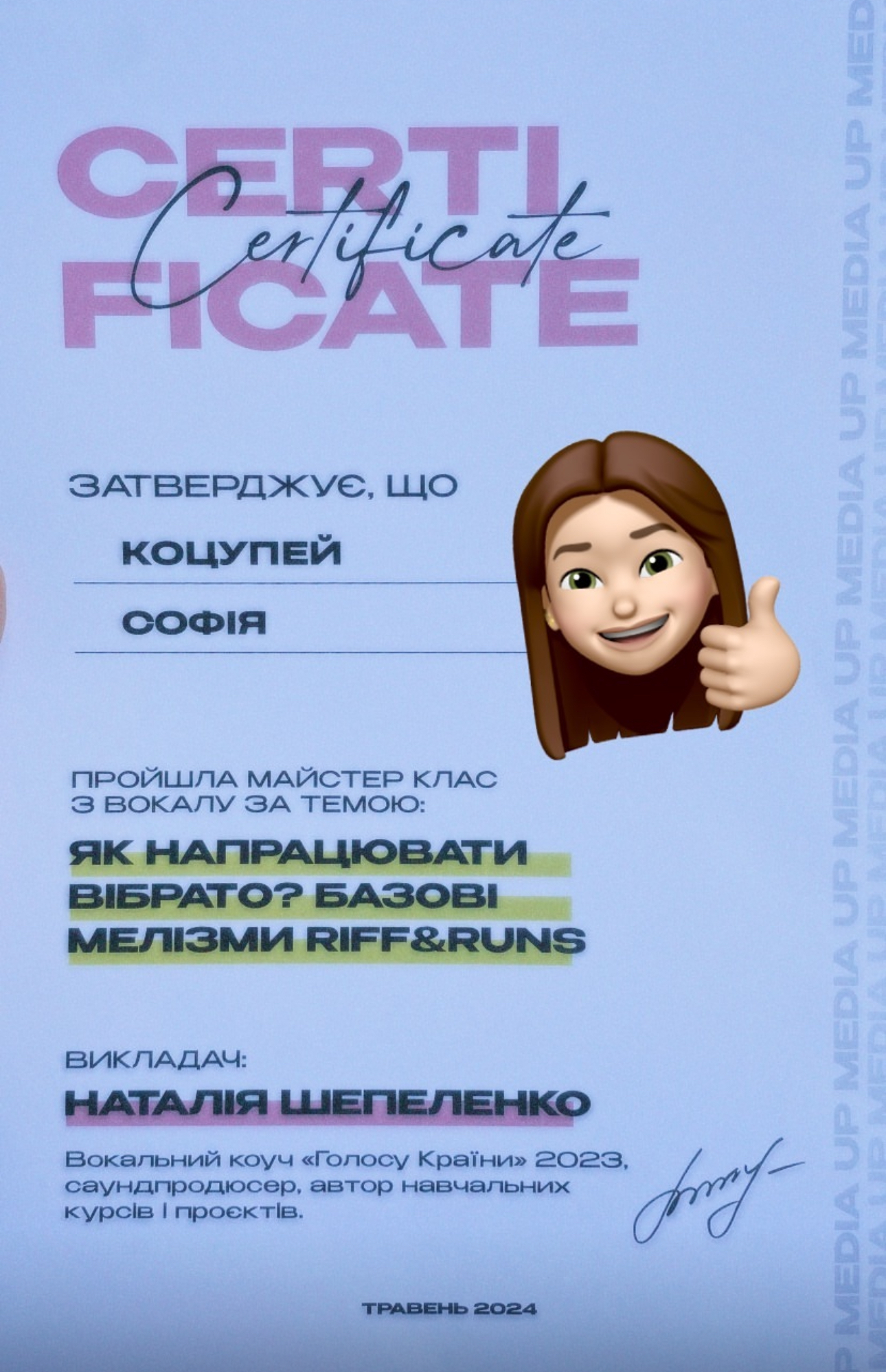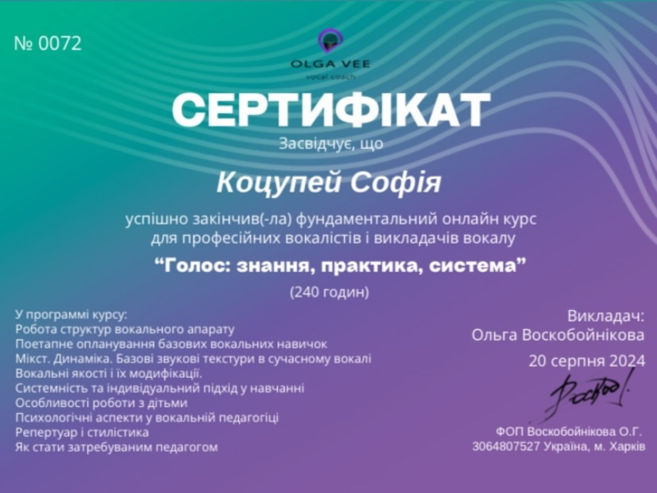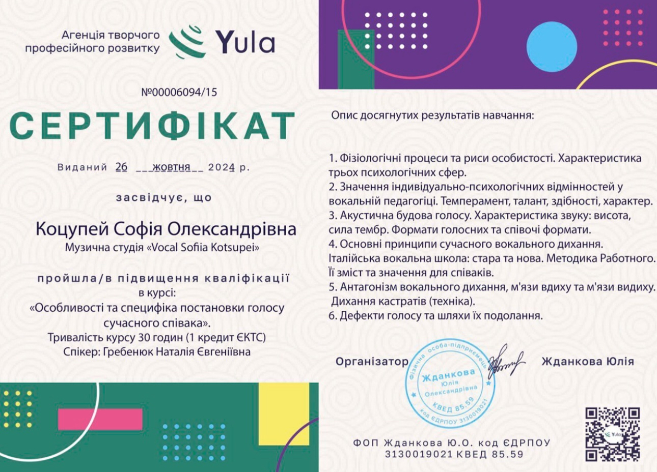 Пропоную ефективні та професійні уроки вокалу м.Дніпро (ЦЕНТР). Досвід викладання з дітками та дорослими. Мої учні отримують ГРАН-ПРІ та призові місця на конкурсах та фестивалях. Займаюсь музикою з 7 років – вокал (академічний та естрадний), фортепіано, гітара. Пройшла додаткове навчання з міжнародної методики Estill Voice Training (EVT).