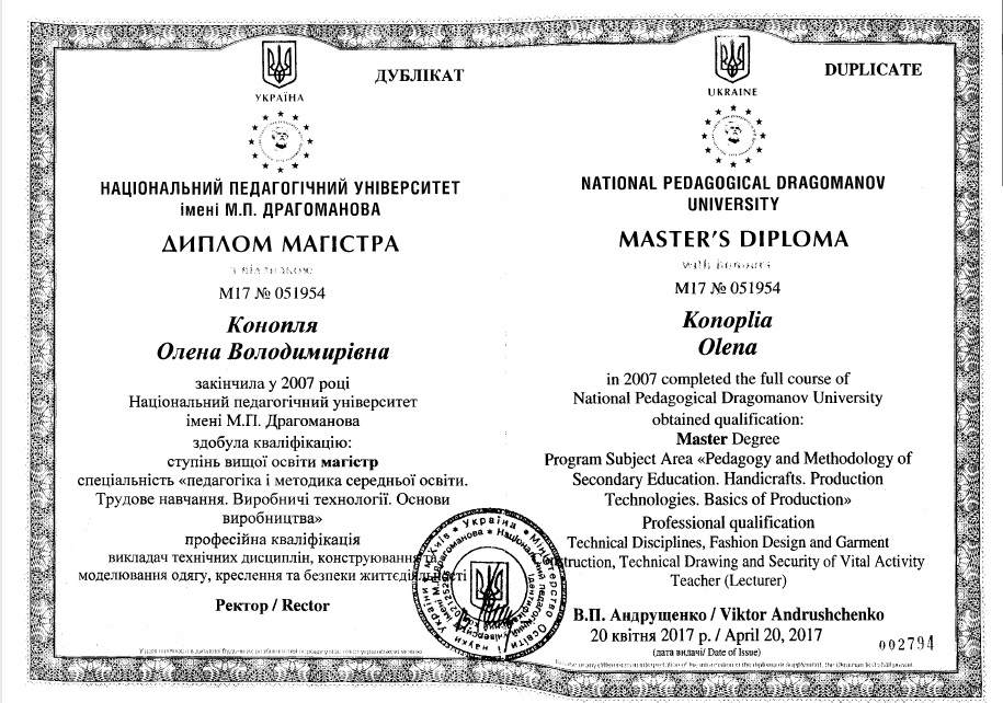 Закінчила Національний педагогічний університет ім. М.П. Драгоманова (магістр), також маю технічну освіту (Національний транспортний університет). Кандидат педагогічних наук, доцент. Викладаю українською мовою