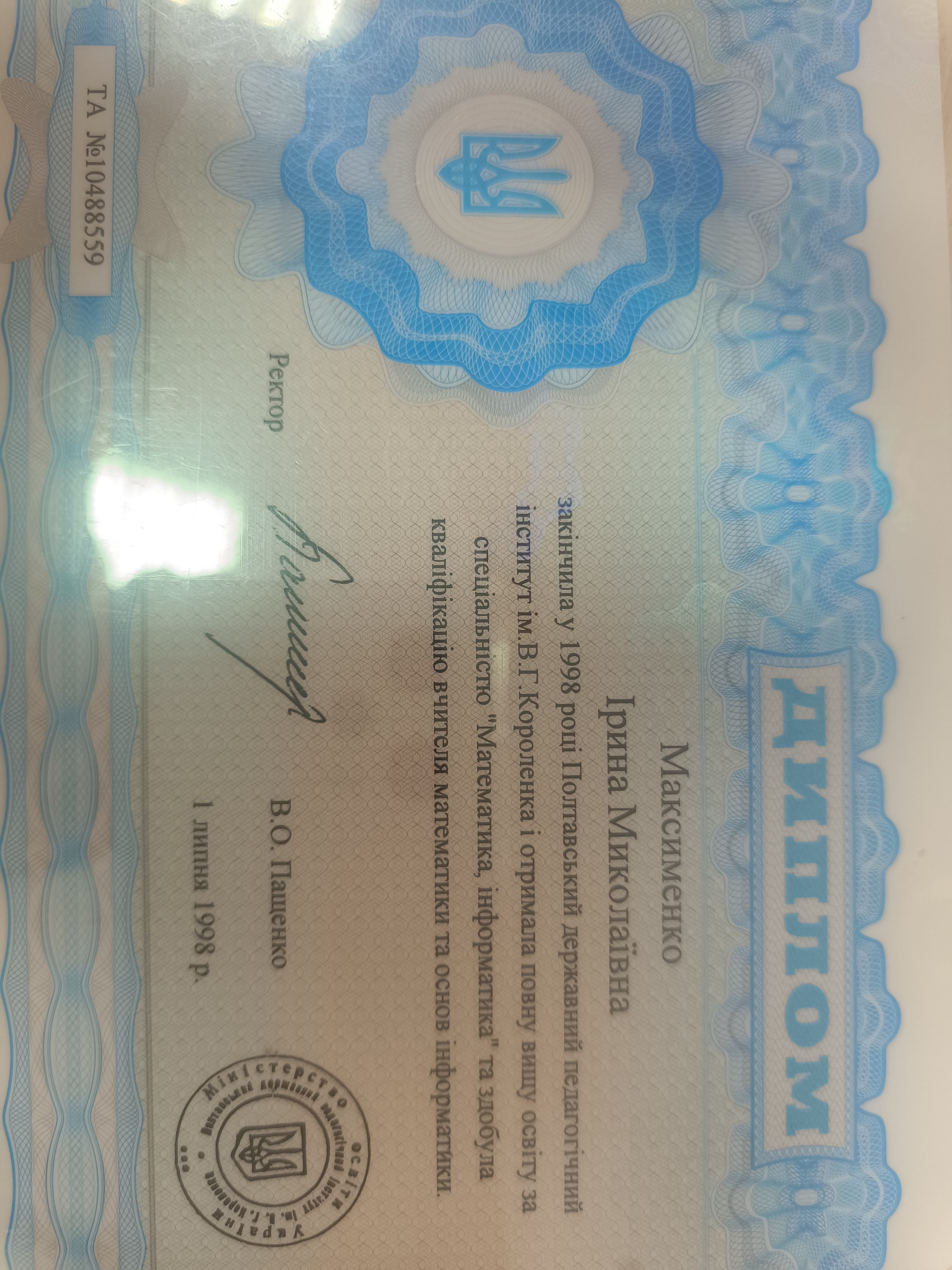 Вітаю! Мене звати Ірина. Стаж роботи вчителем математики 18 років. Люблю цей предмет. Постійно навчаюсь, вдосконалююсь і розвиваюсь.. Працюю на результат..