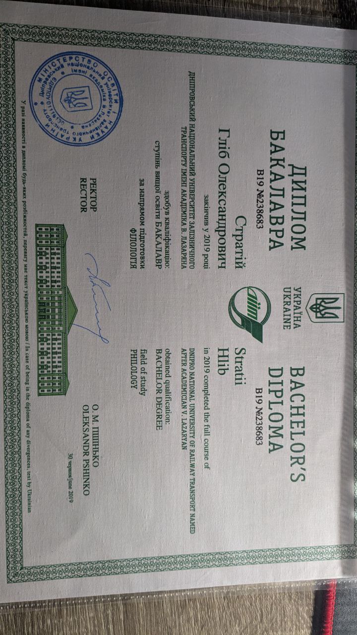 Вітаю! Я — викладач із повною вищою лінгвістичною освітою (ДНУЗТ ім. Лазаряна, червоний диплом магістра) та восьмирічним досвідом викладання, частину якого здобув у приватній школі та на сертифікованих курсах підготовки до кембриджських іспитів; маю чотири роки репетиторства та три роки викладання в університеті. Є автором низки наукових статей із викладання іноземних мов та їх порівняльного аналізу. Також займаюся технічним і усним перекладом. Англійською мовою розмовляю значно частіше і впевненіше, ніж навіть рідними російською та українською. Працюю як із дорослими, так і з дітьми. За потреби опрацьовуємо Business English або конкретні лексичні сфери.