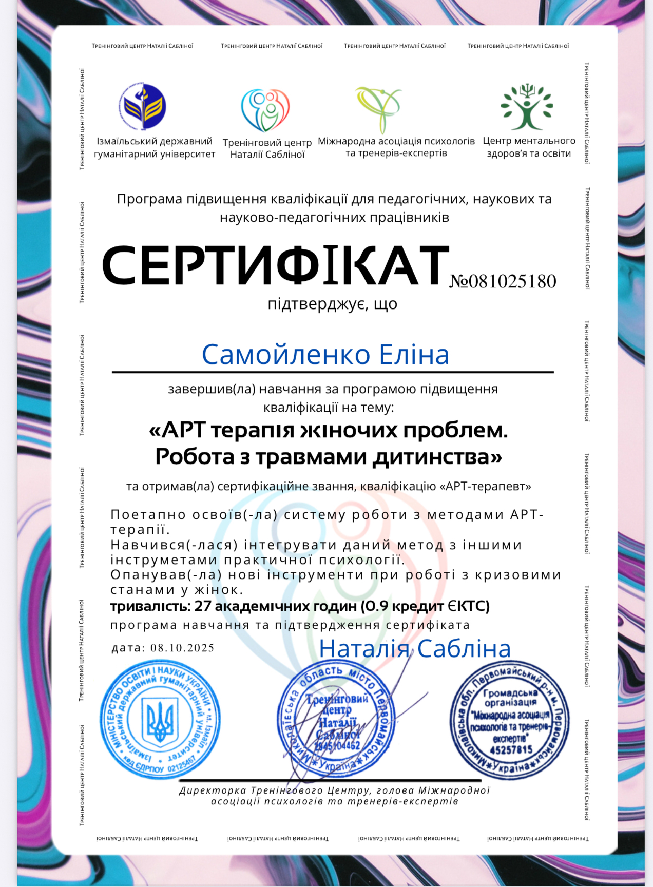 Я - Еліна- практичний психолог, арт-терапевт з понад 5 річним досвідом роботи, спеціалізуюсь на кризовій підтримці, практичній і корекційній психології, робота з привʼязаністю і побудова довірливих стосунків із дитиною. Працюю з батьками та опікунами, дітьми і підлітками.