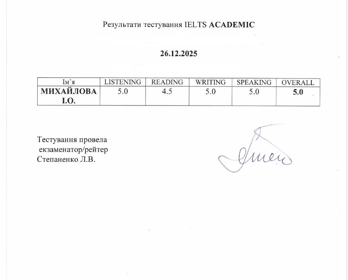 Маю досвід викладання англійської мови для різних вікових категорій — від дітей до дорослих. У своїй практиці використовую сучасні комунікативні методики, зокрема CELTA-підхід, Test-Teach-Test (TTT) та Lexical Approach. Акцентую увагу на розвитку мовленнєвих навичок, розширенні словникового запасу та практичному застосуванні мови в реальних ситуаціях. Маю Сертифікат IELTS 5.0 2025 .