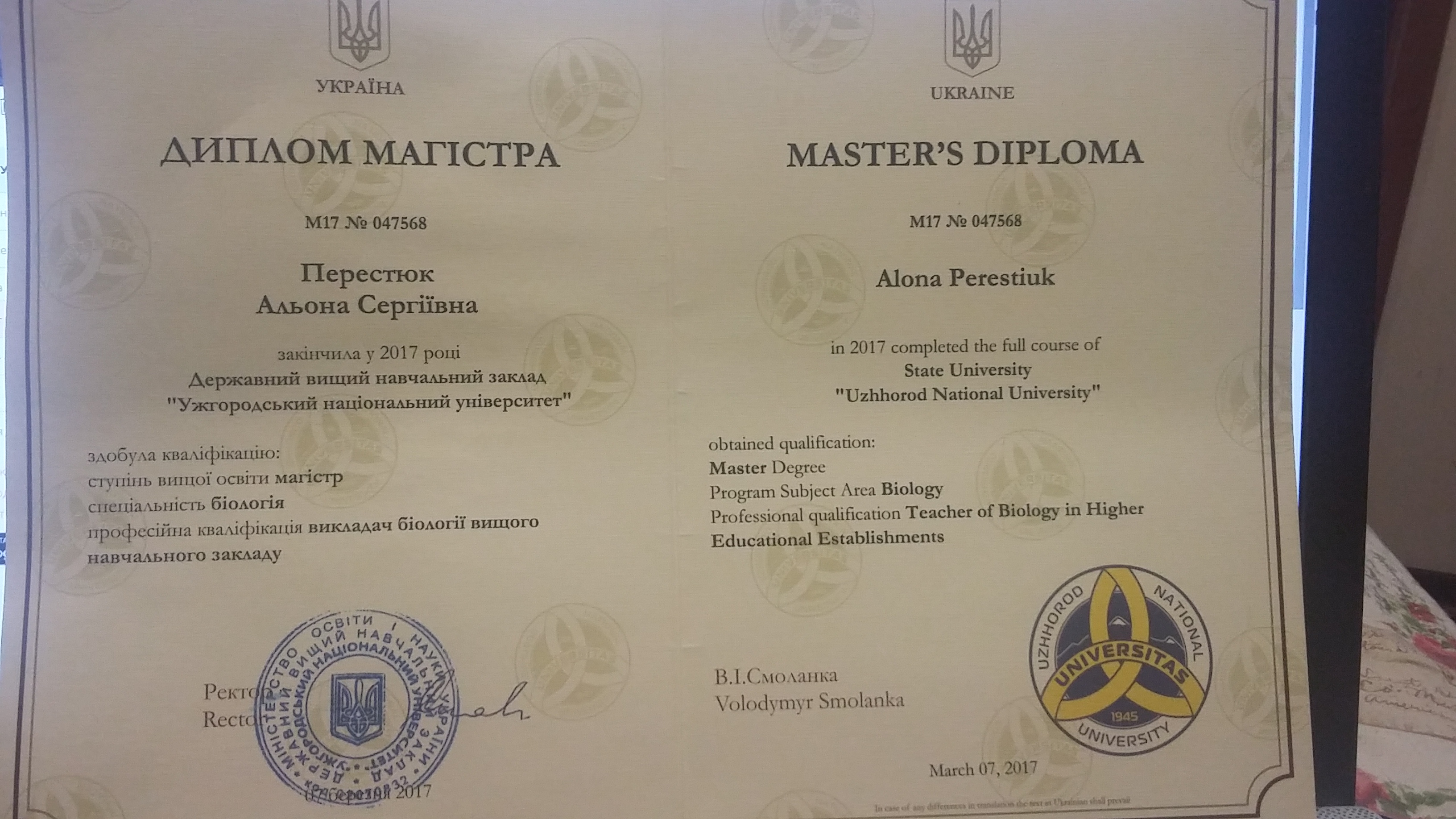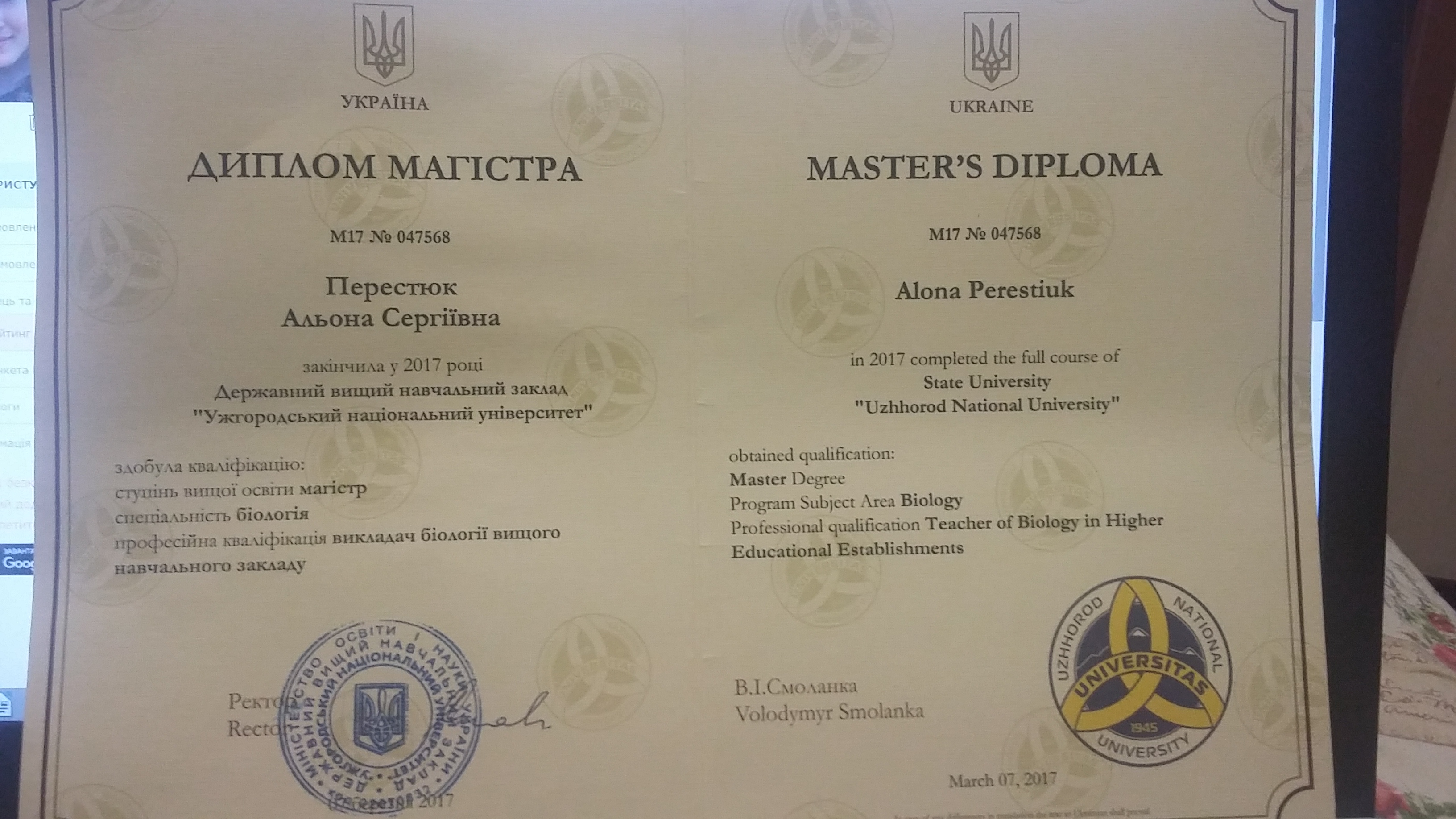 У 2017 році закінчила біологічний ф-т; отримала диплом магістра; диплом бакалавра отримала з відзнакою; на даний час навчаюся в аспірантурі. Досвід репетиторства 1.5 роки. Люблю викладати, подаю предмет в доступній та цікавій формі. При викладанні застосовую інноваційні технології, обов'язково наводжу приклади з життя.
