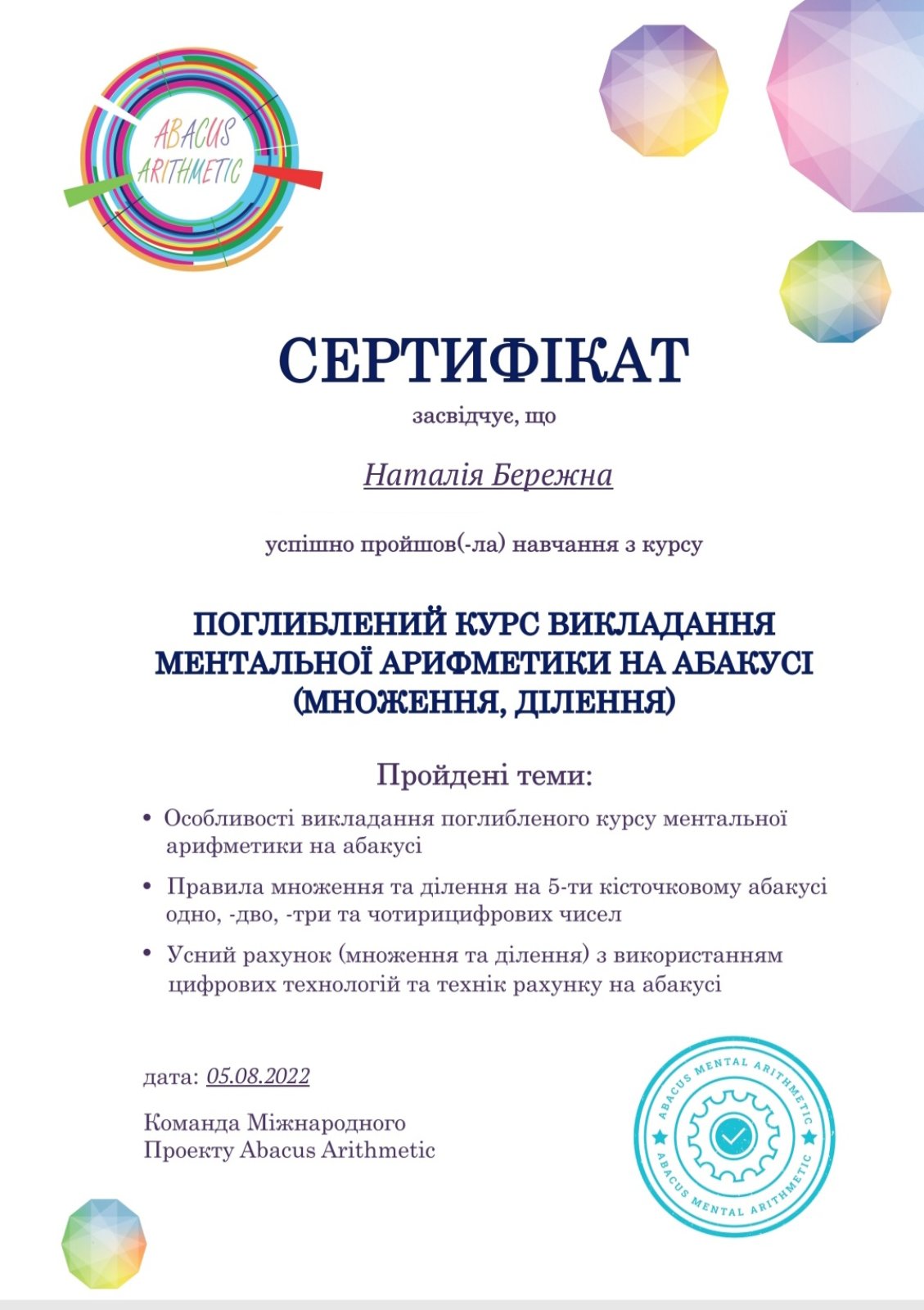 Ментальна арифметика-це методика розвитку інтелекту через швидкий рахунок .На уроках виконуємо складні арифметичні операції(додавання,віднімання, множення, ділення).Тренуючи обидві півкулі головного мозку. Покращення у дітей концентрації,пам'яті,уваги,мислення, логіки.Здатність рахувати усно великі числа.