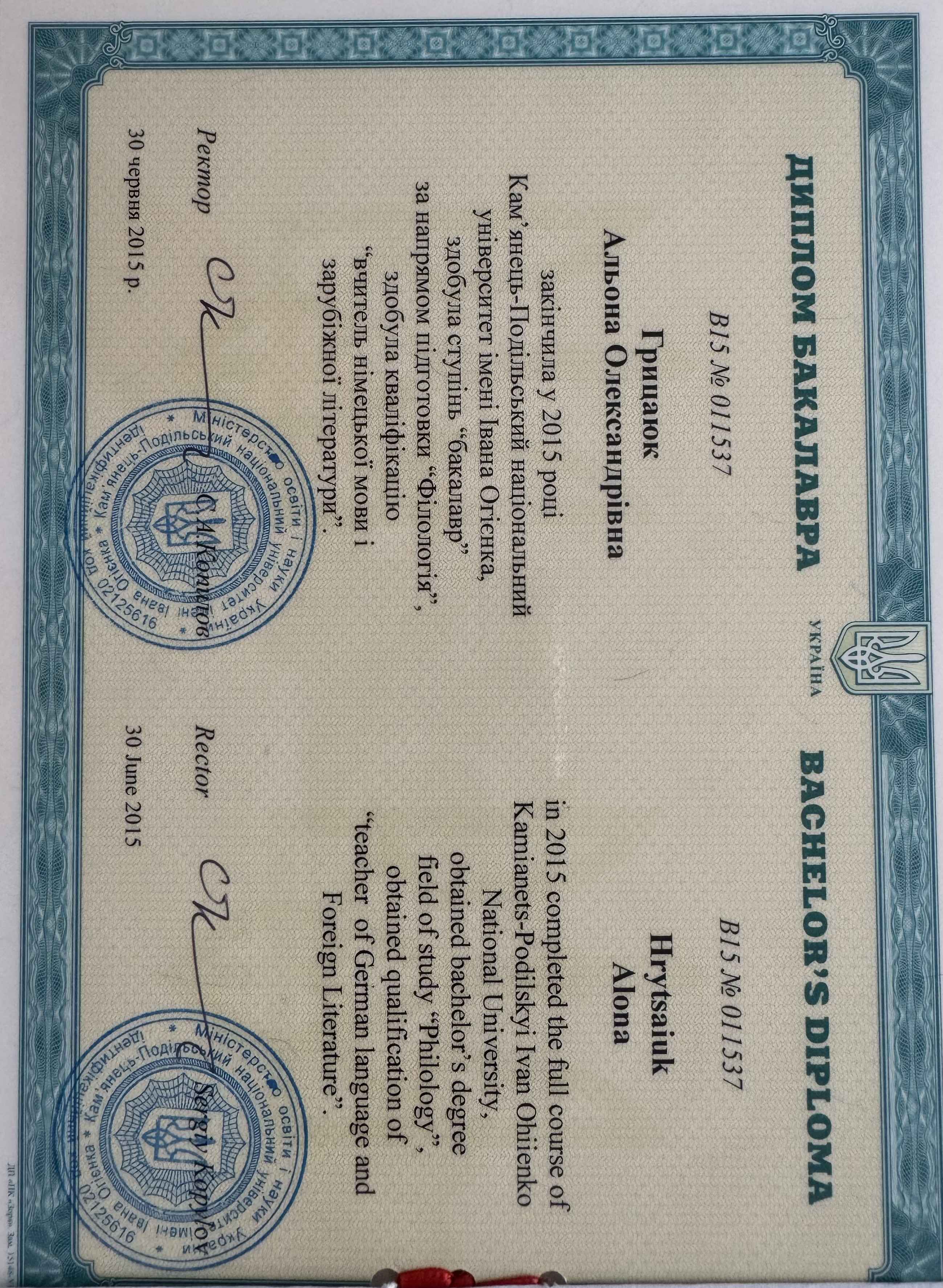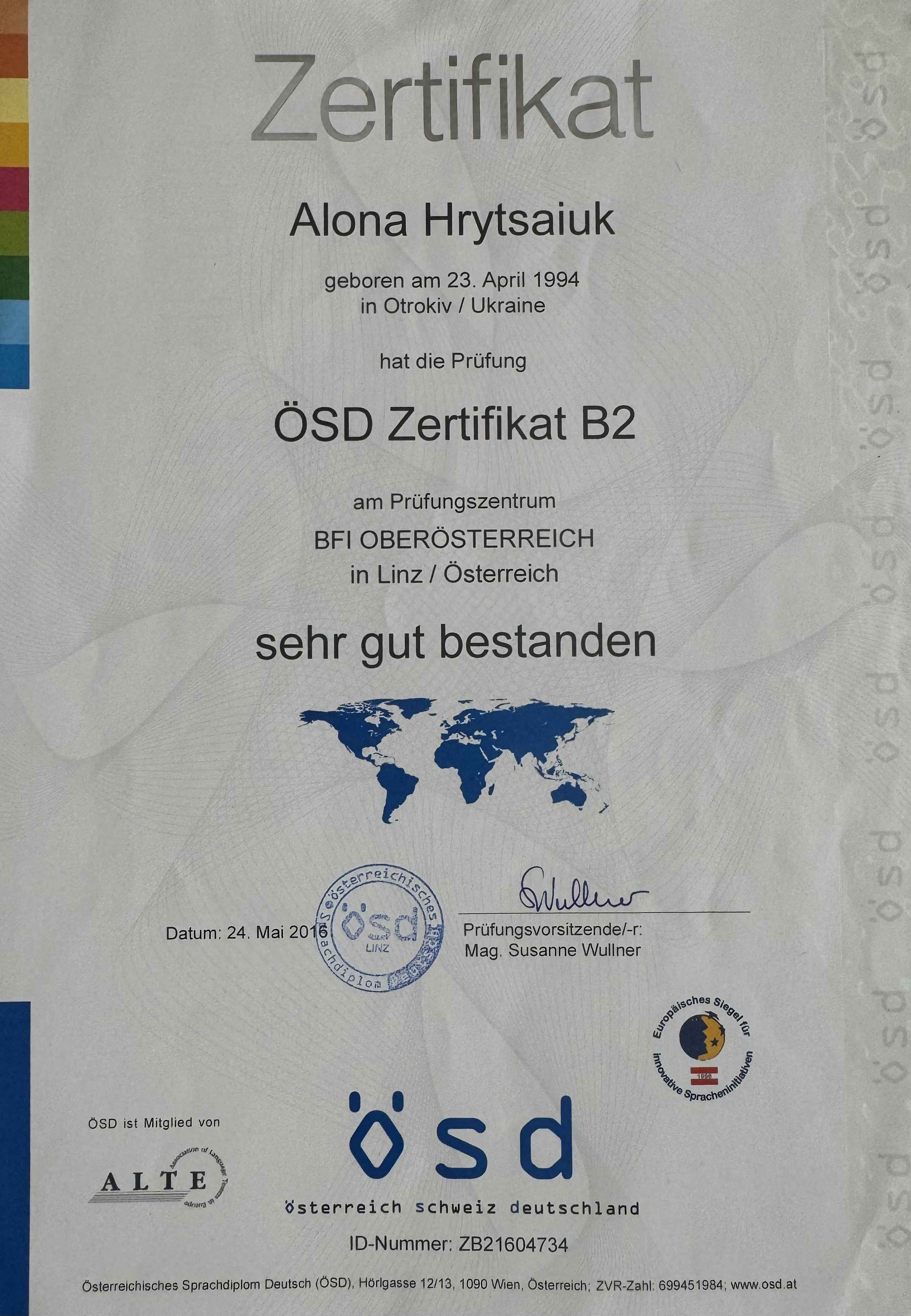 У 2013 році працювала в Німеччині. З 2015 року проживаю в Австрії, щодня спілкуюсь з іноземцями у німецькомовному середовищі, працюю в міжнародній компанії та навчаюсь у Віденському університеті. Успішно закінчила університетські курси «Business German”. Є сертифікат знання мови, досвід роботи репетитором.