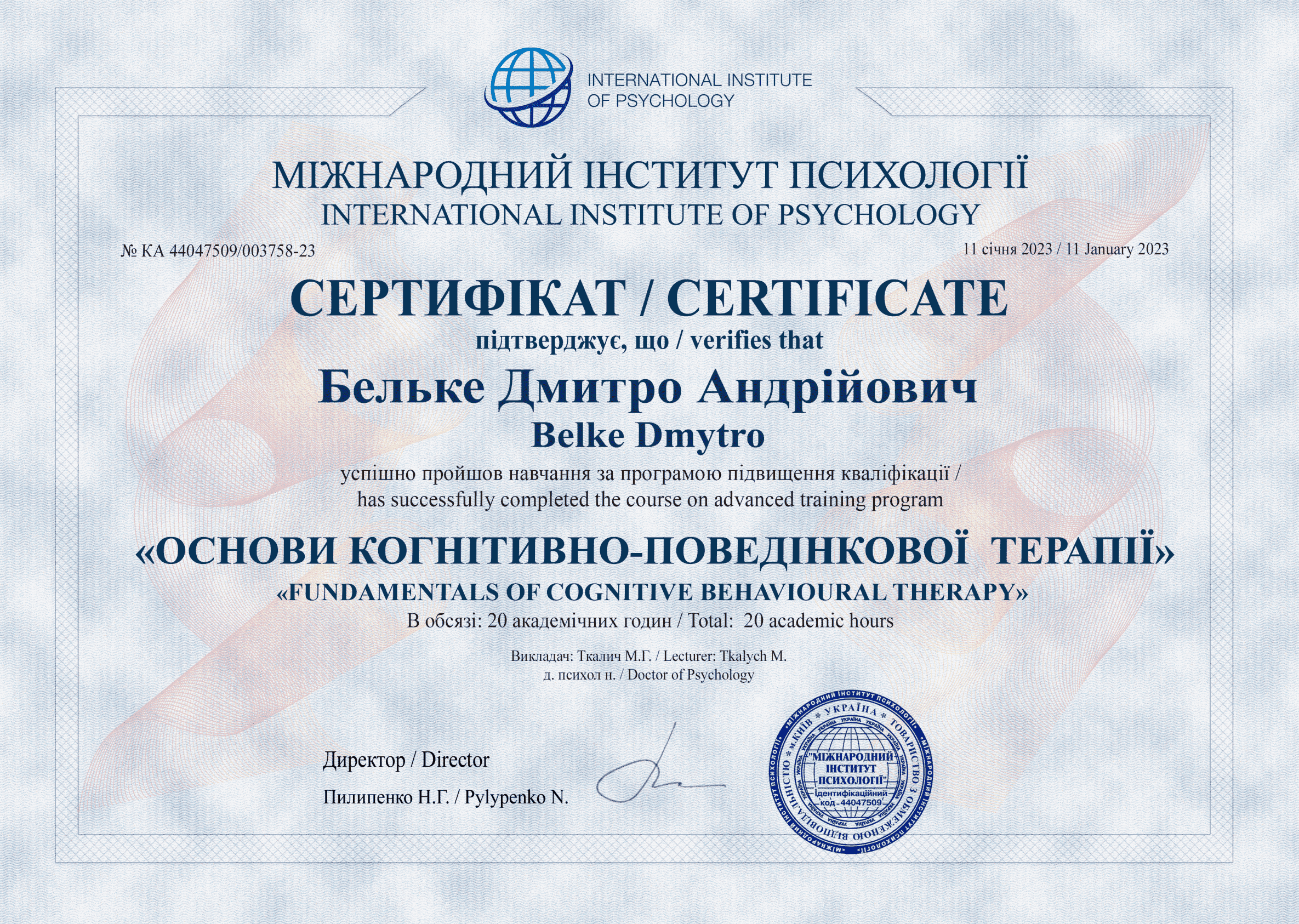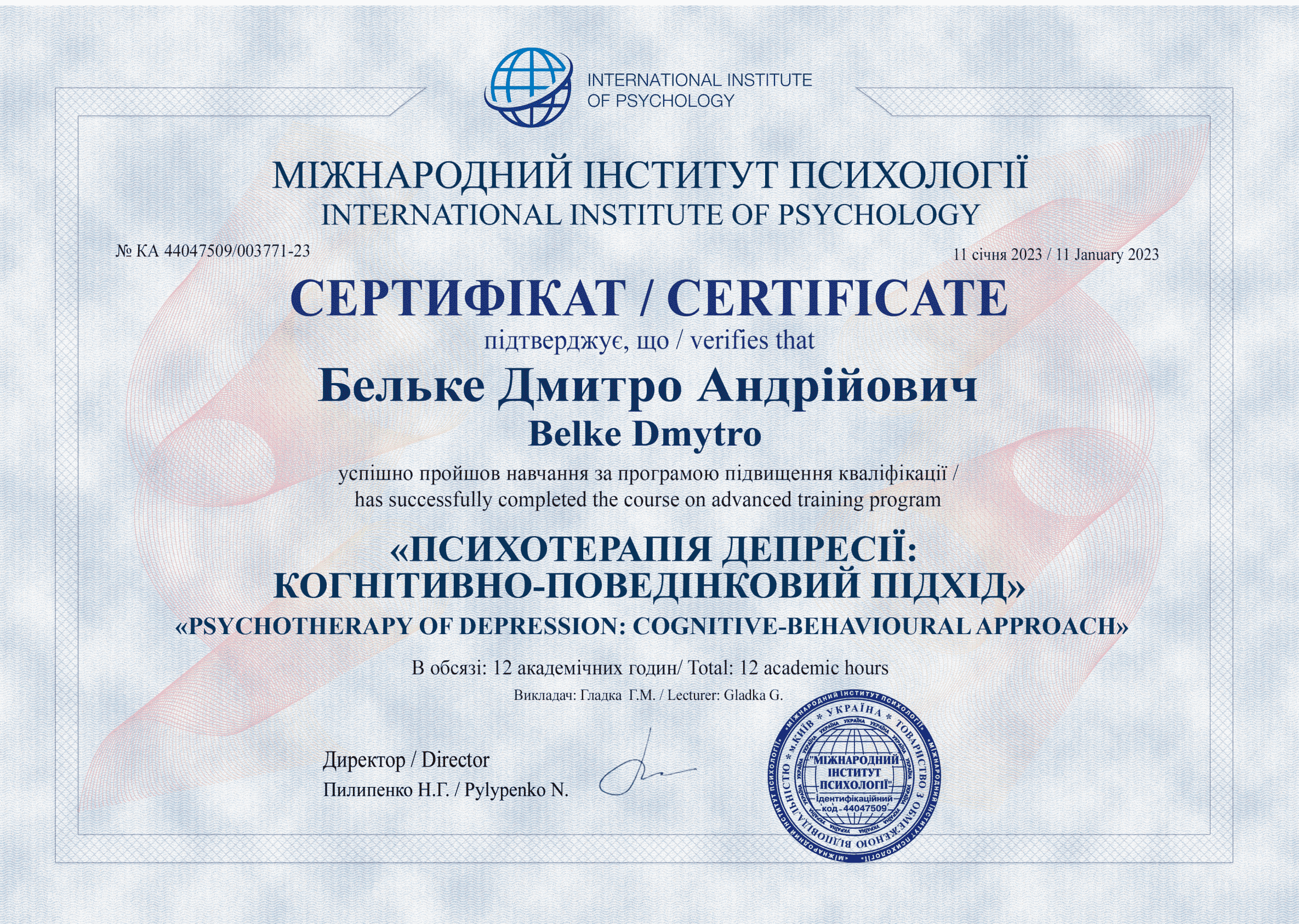 - Також маю сертифікацію для роботи з ПТСР, РХП, ОКР, ДЕПРЕСІЄЮ, МЕЖОВИМ РОЗЛАДОМ. КПТ підхід. Важливо: це йде як вибір мене в додаток до роботи\терапії психіатра\психотерапевта. Сам діагностику я не веду.