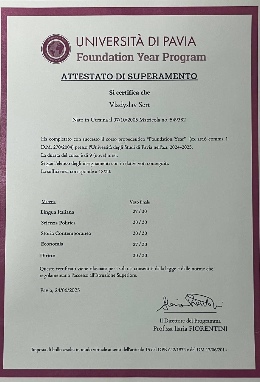 На сьогодні я навчаюся в університеті міста Павія за спеціальністю “Юриспруденція”, що додатково розвиває мою академічну і професійну мову, зокрема юридичну італійську.