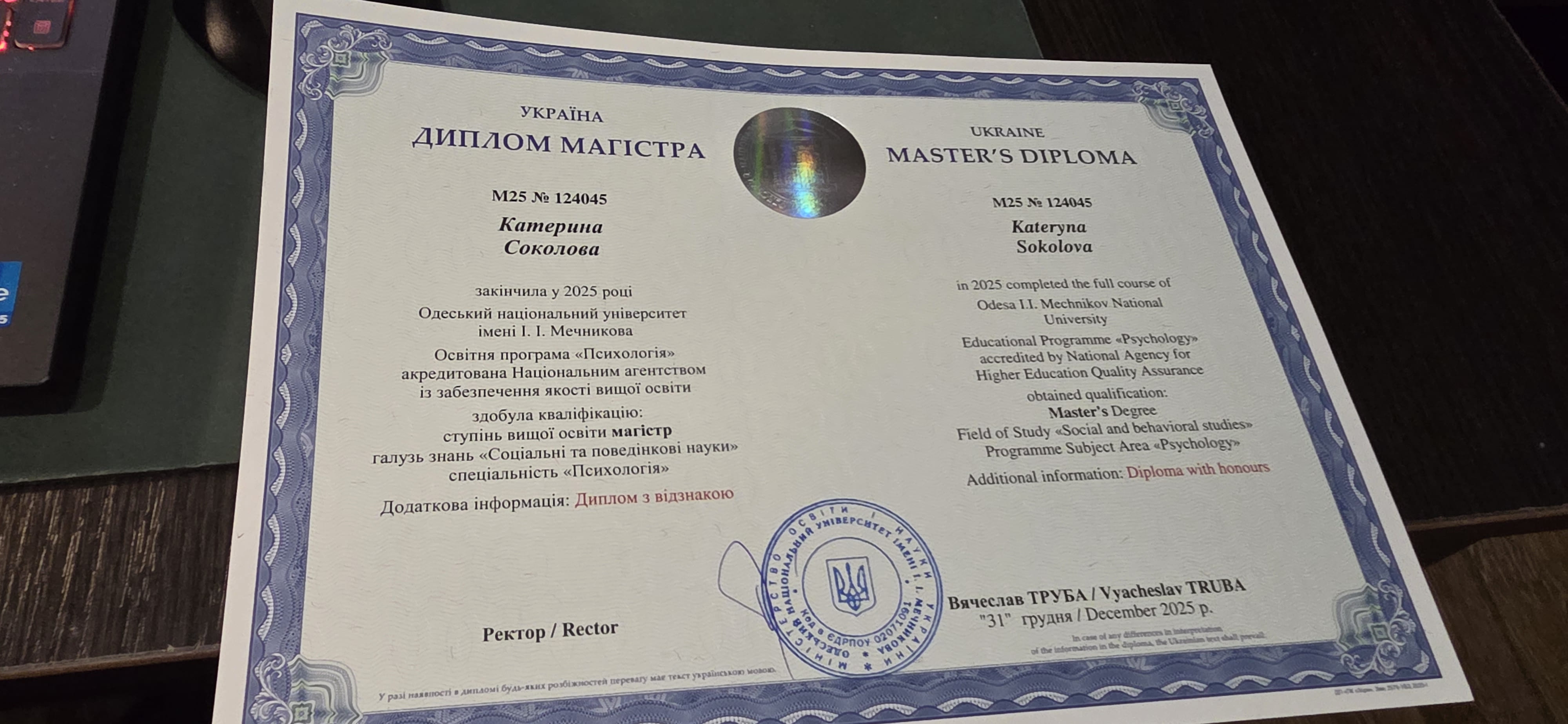 Професійна підтримка, коли власних ресурсів бракує для життєвих завдань. Допомагаю структурувати події та відрізнити ваші істинні цілі від нав'язаних. Освіта клінічного психолога дає мені змогу глибоко розуміти механізми стресу та адаптації, роблячи роботу точною та безпечною.