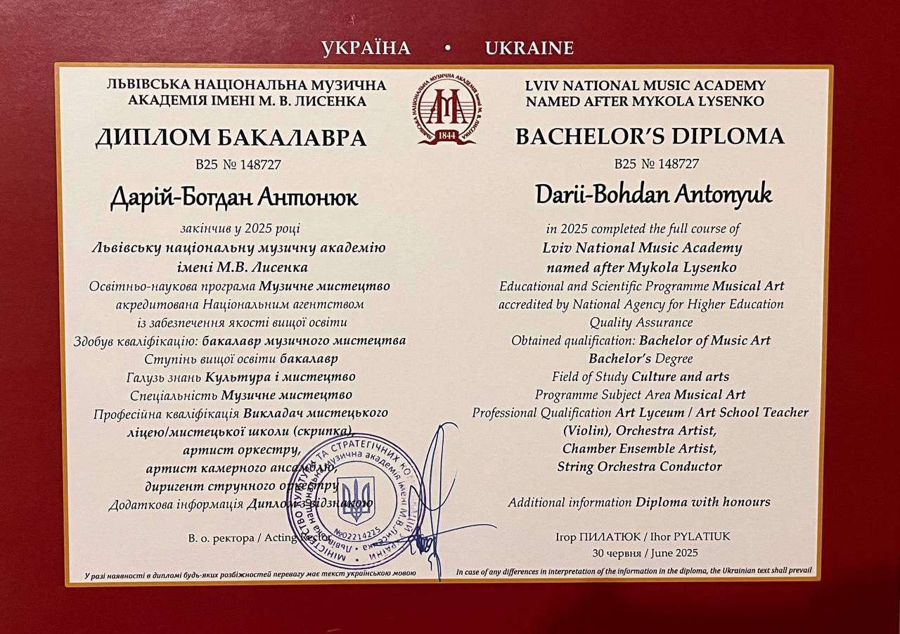 • Професійний досвід: Більше 16 років гри на скрипці та фортепіано та участі в концертах.