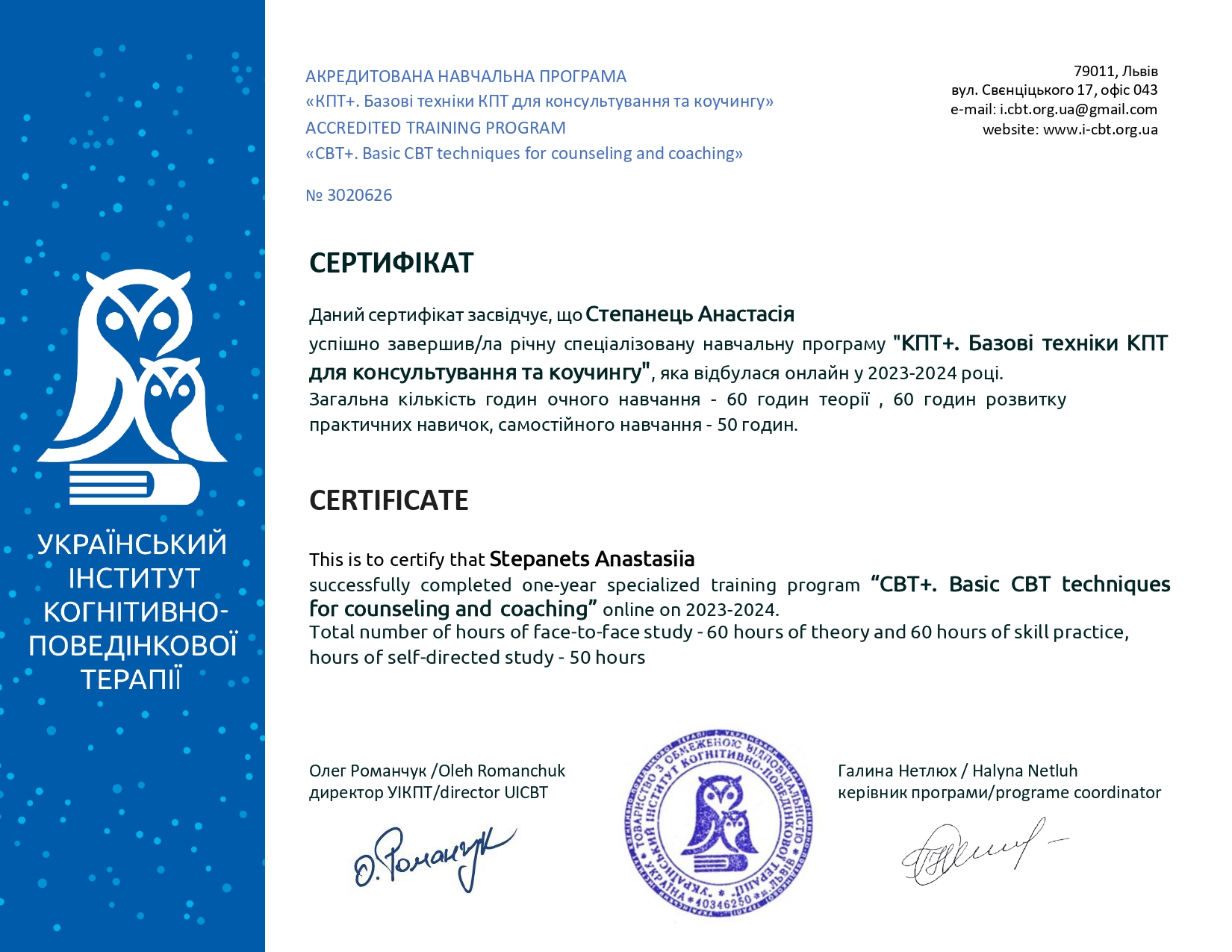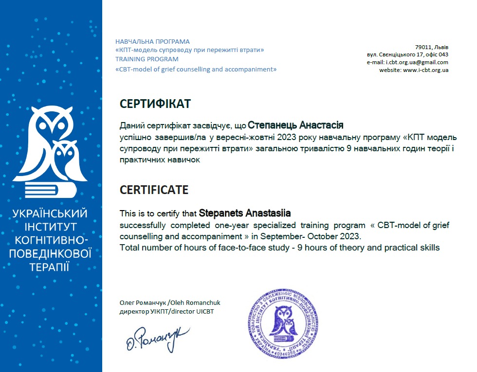 Я є дійсним членом Української асоціації когнітивно-поведінкової терапії.