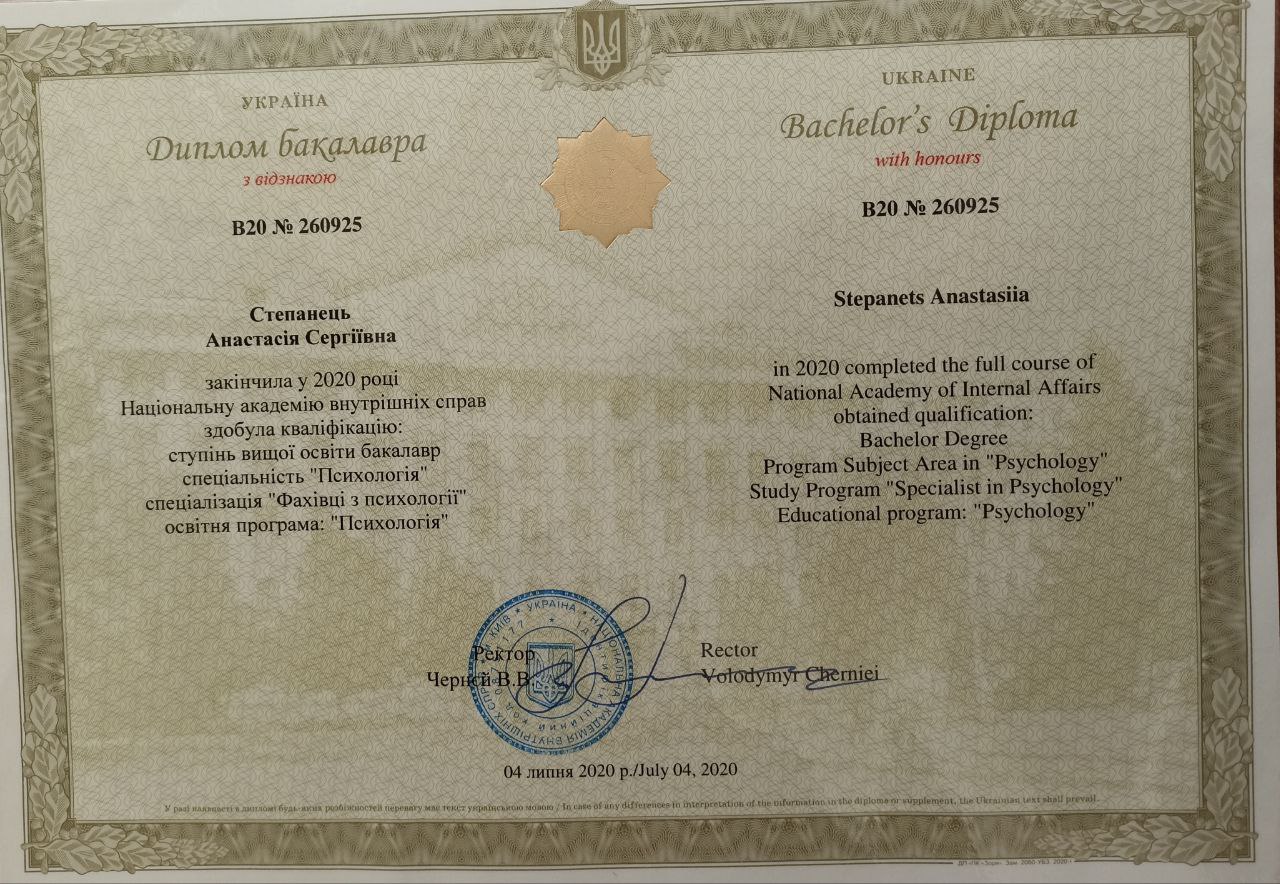Мене звати Анастасія Степанець, я дипломована психологиня. Працюю з дорослими та підлітками у напрямках когнітивно-поведінкової терапії та діалектично-поведінкової терапії.