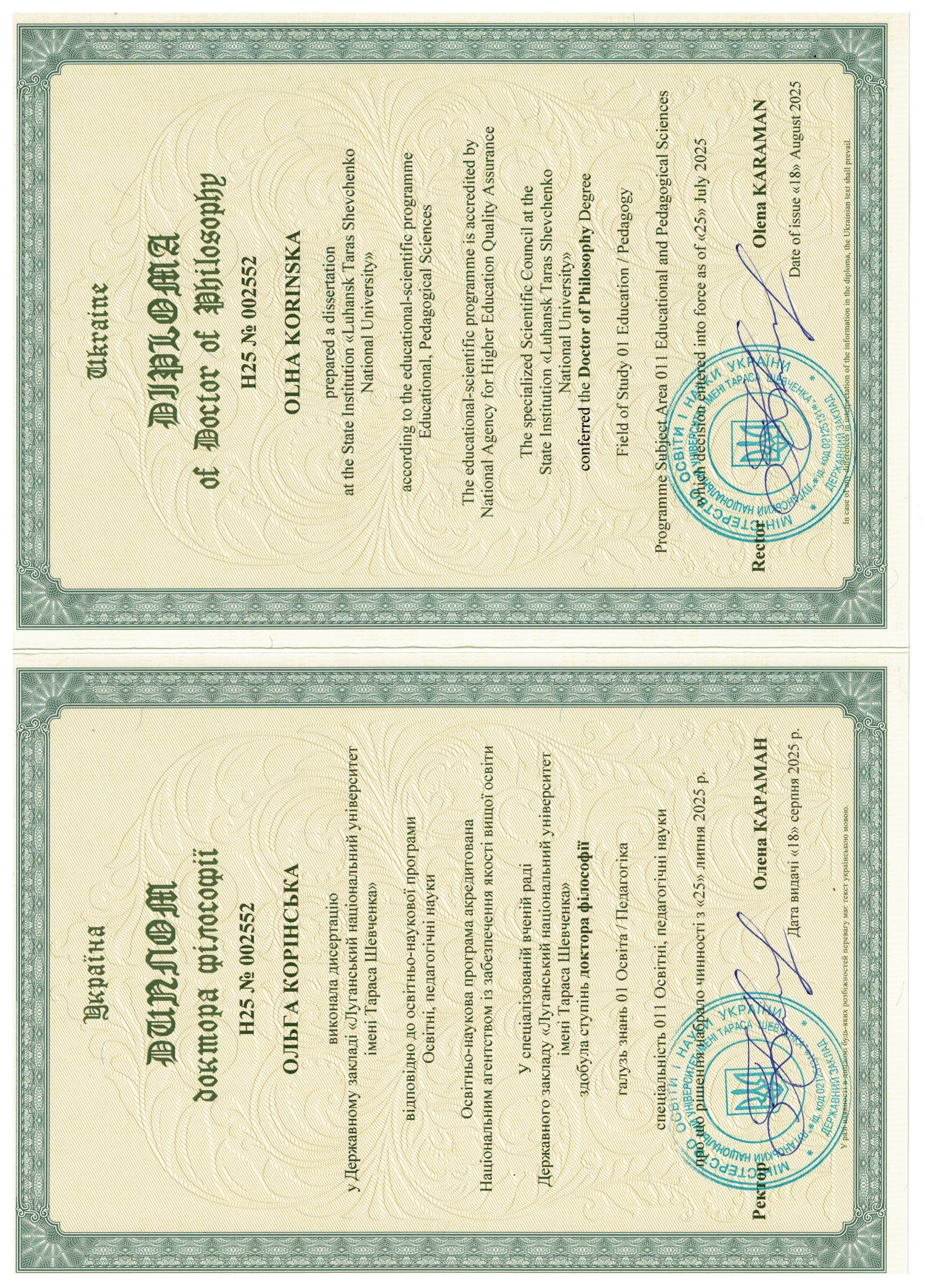 Доктор філософії (PhD), дипломований викладач англійської мови й перекладу. Маю досвід роботи вчителем у загальноосвітній школі, приватній школі та закладі вищої освіти.