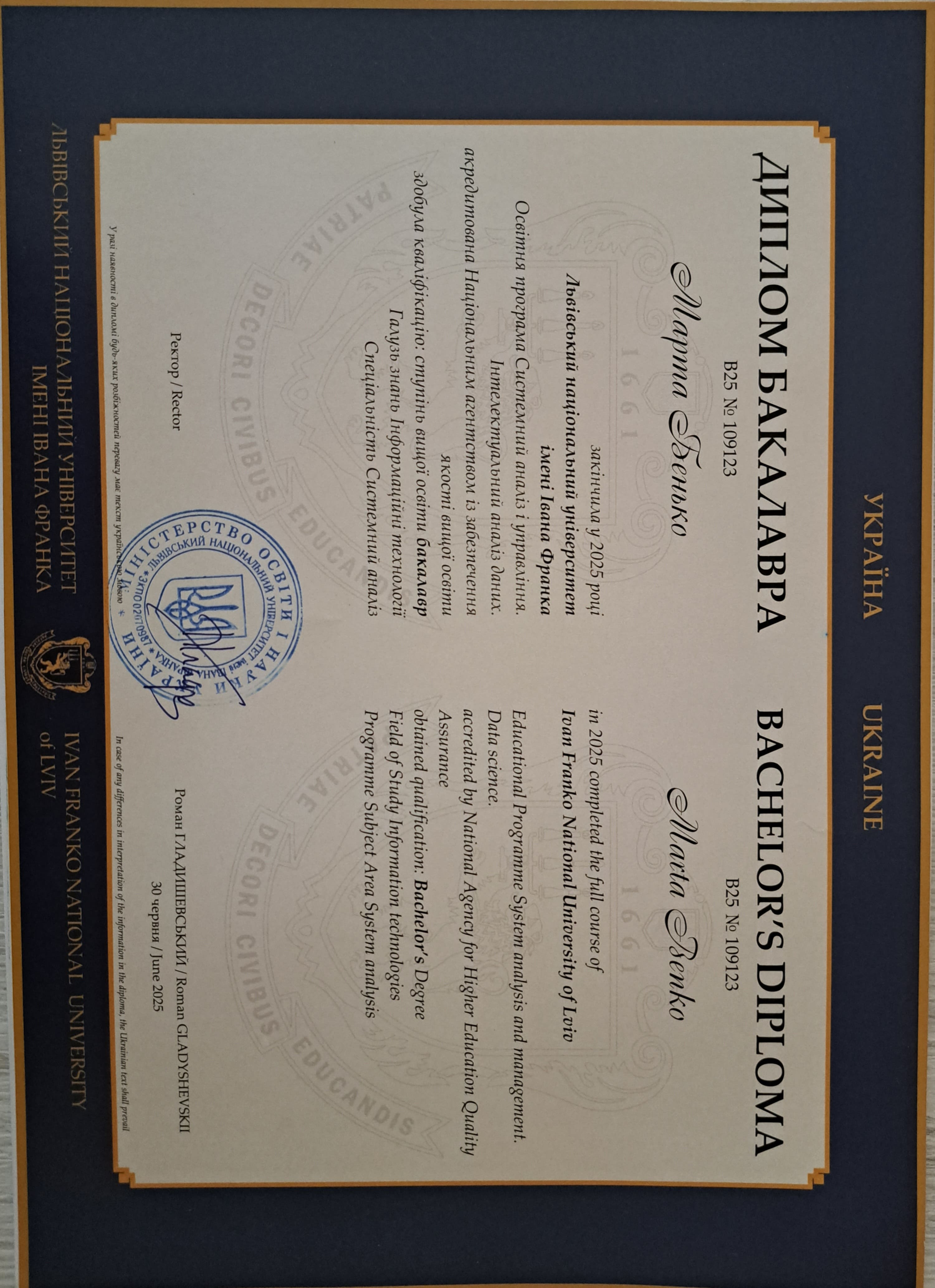 • Навчаюсь на 1 курсі магістратури факультету прикладної математики ЛНУ • Закінчила бакалаврат спеціальності Системний аналіз в ЛНУ • Склала ЗНО 2021 на 194 бали