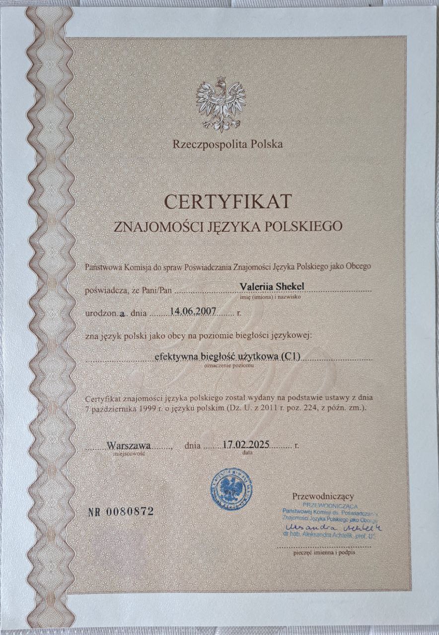 Я володію польською мовою на рівні С1 та продовжую здобувати освіту в польському університеті. Стежу за прогресом та досягненнями своїх учнів, намагаючись забезпечити комфортні і продуктивні умови для навчання