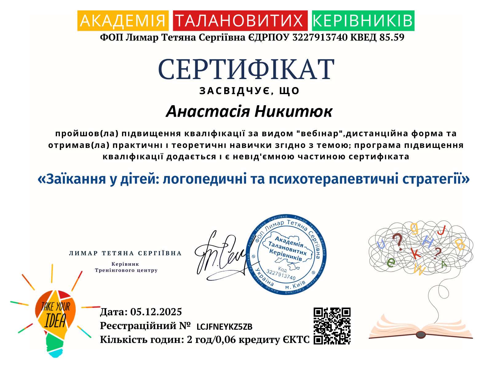 Професіоналізм: Маю вищу психологічну освіту та постійно підвищую кваліфікацію на спеціалізованих курсах і вебінарах.